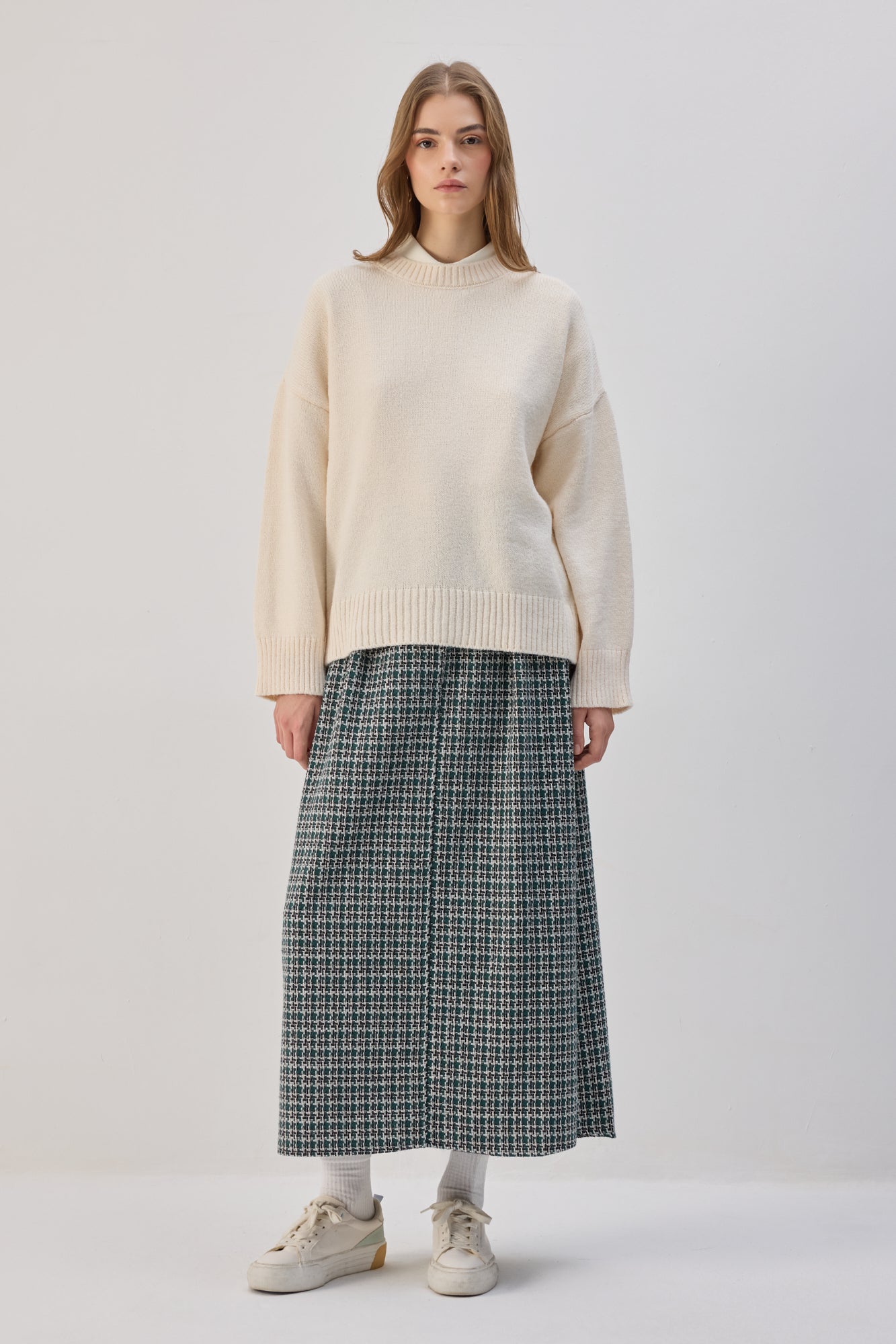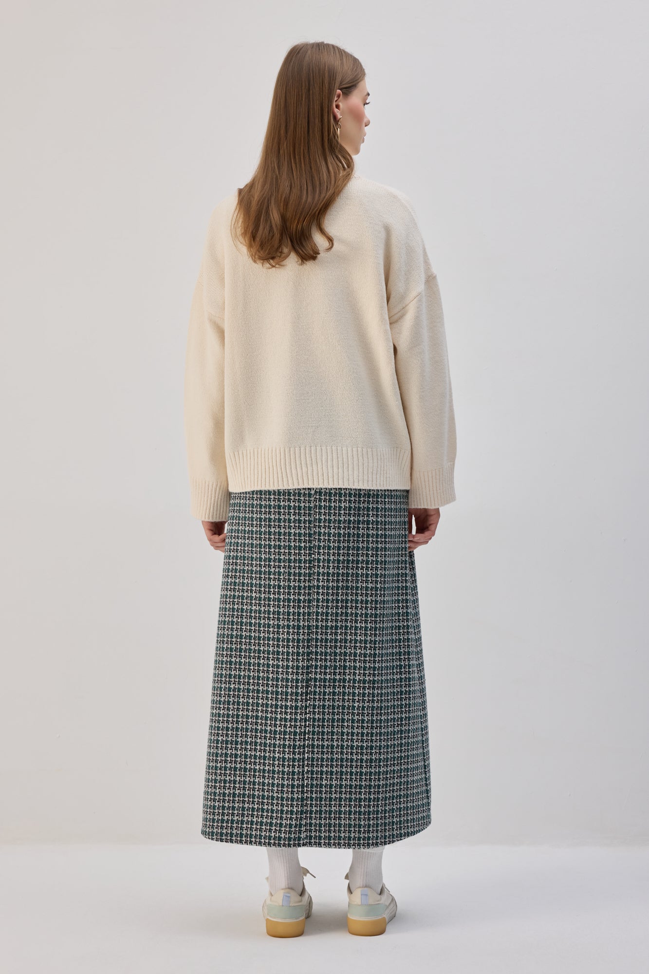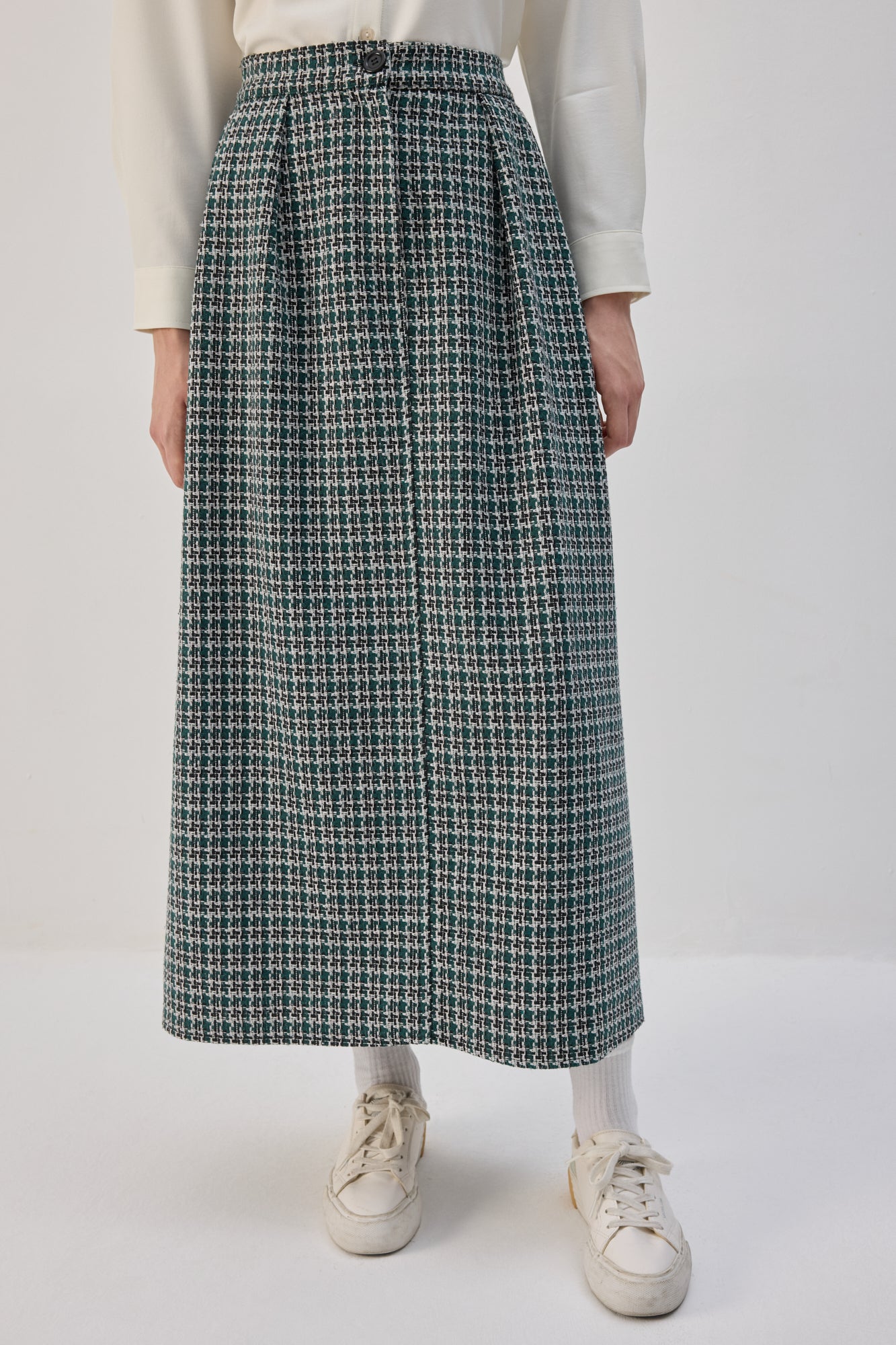 Tüvit dokulu. Yüksek bel. Pileli etek.