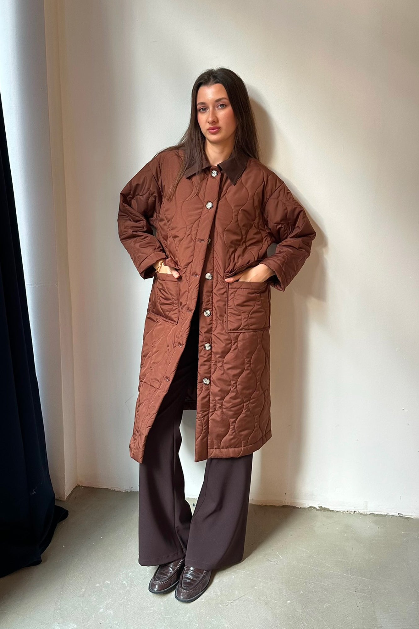 Kapitone uzun mont. Kuş gözü düğmeli, cepli, sıcak tutan tasarım.