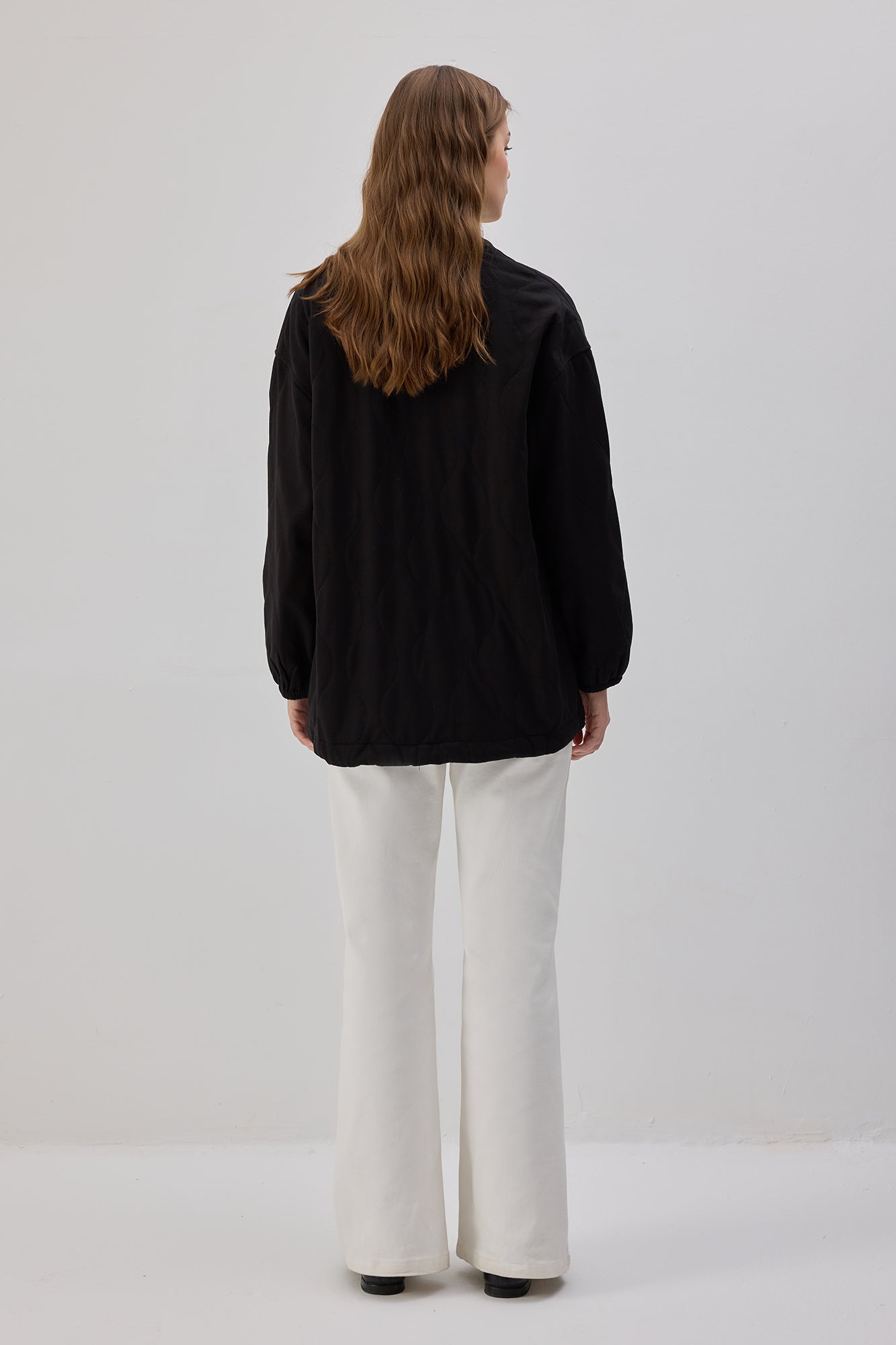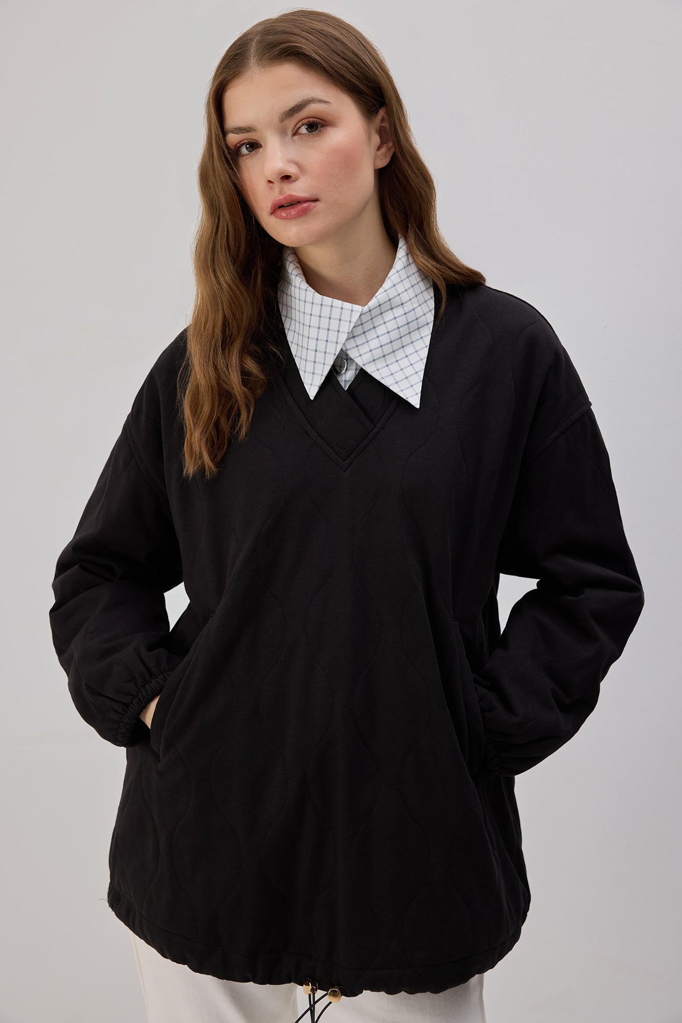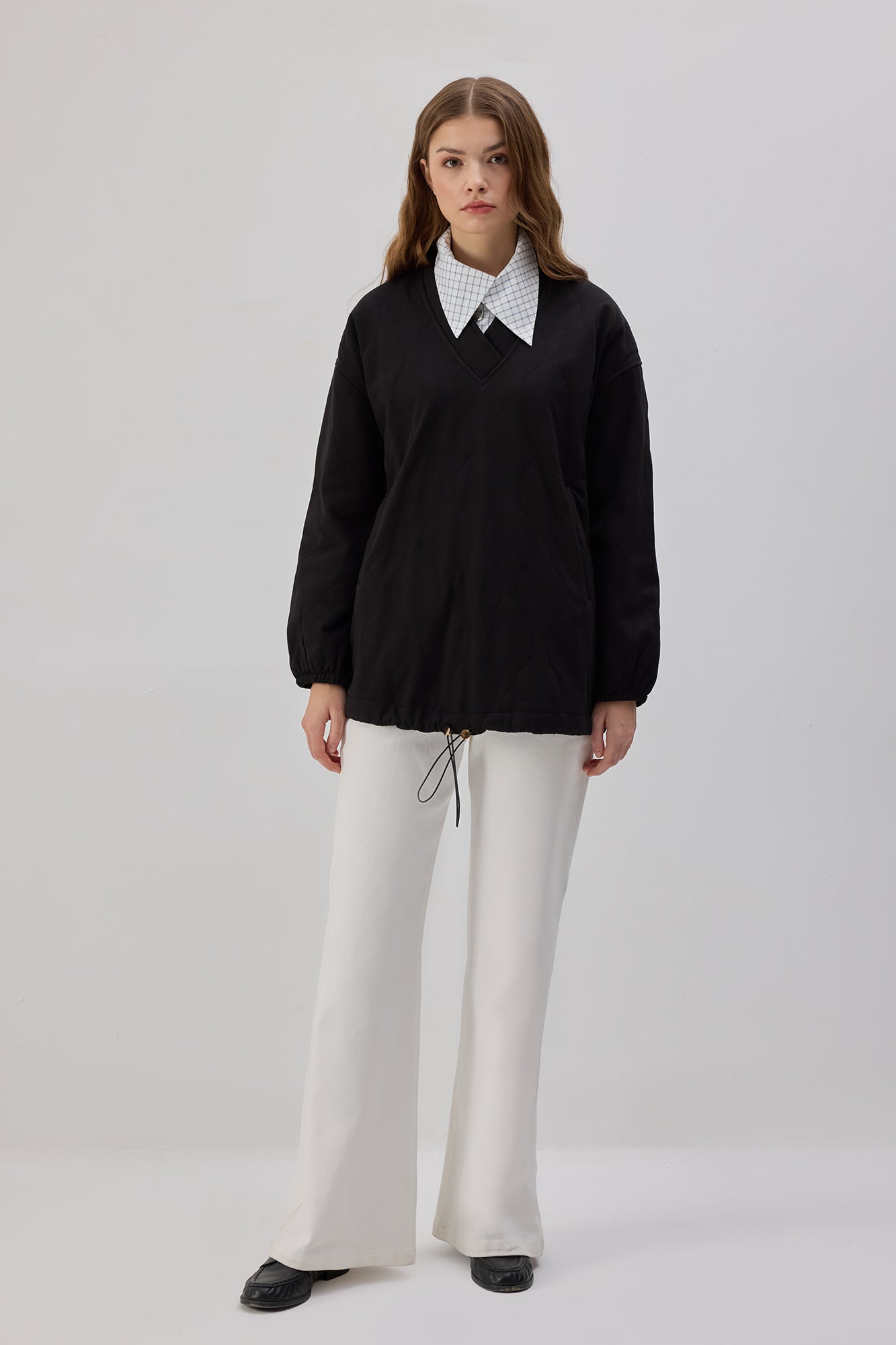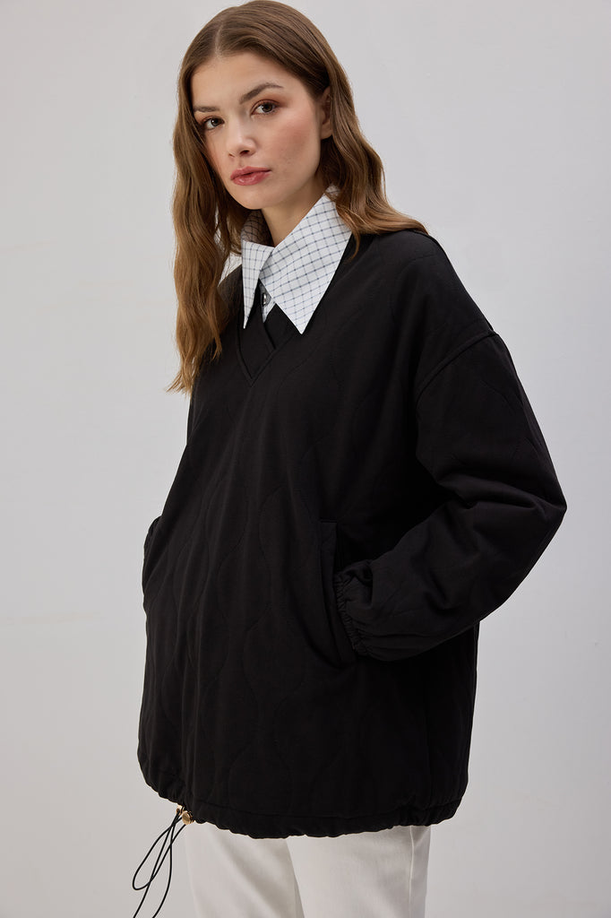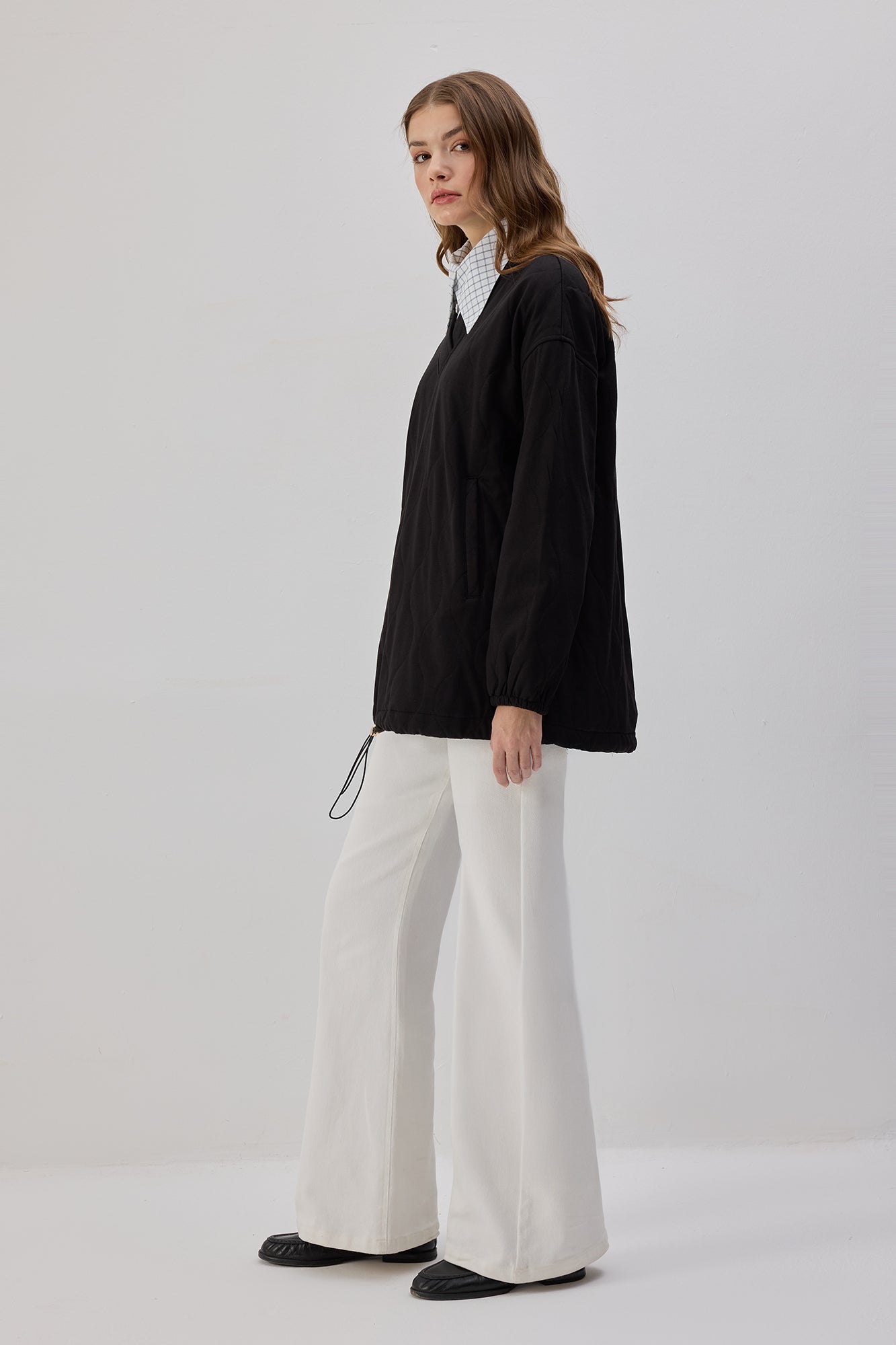 V yaka. Yan cepli. Ayarlanabilir etek ucu. Elastik manşet. Kapitone sweatshirt.