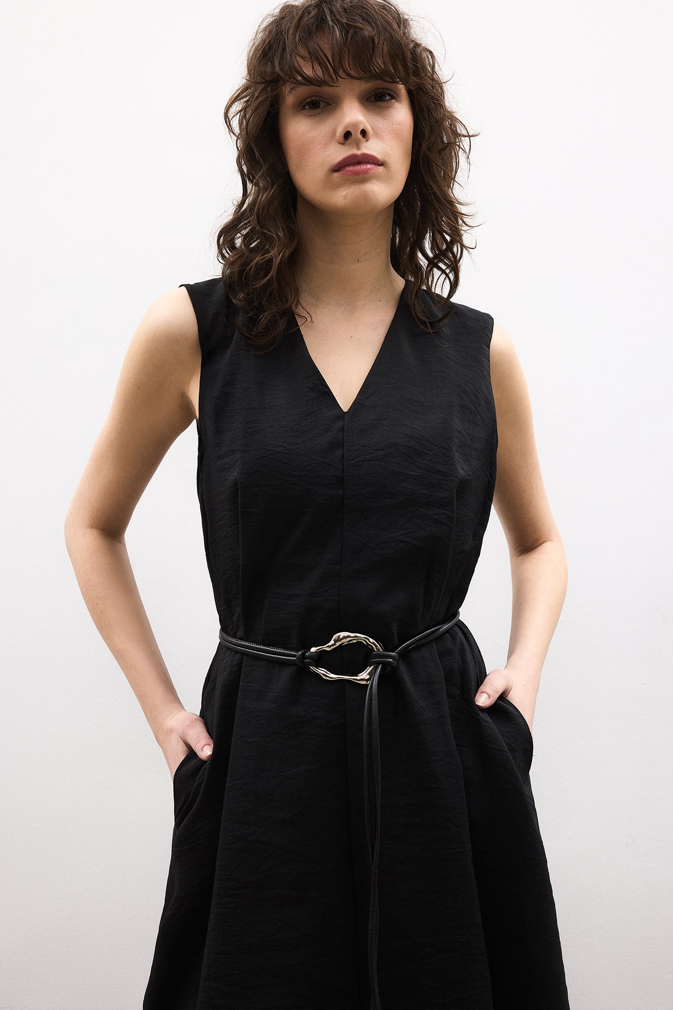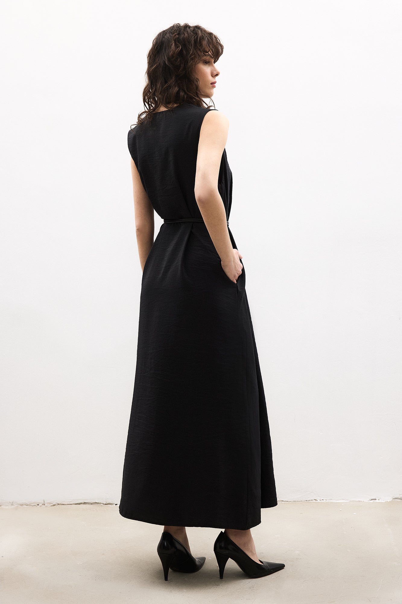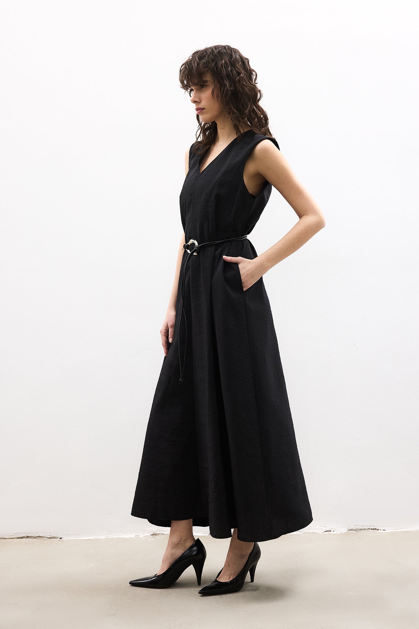 V yaka. Kolsuz. Çıkarılabilir kemerli. Yan cepli. Kupra jile.