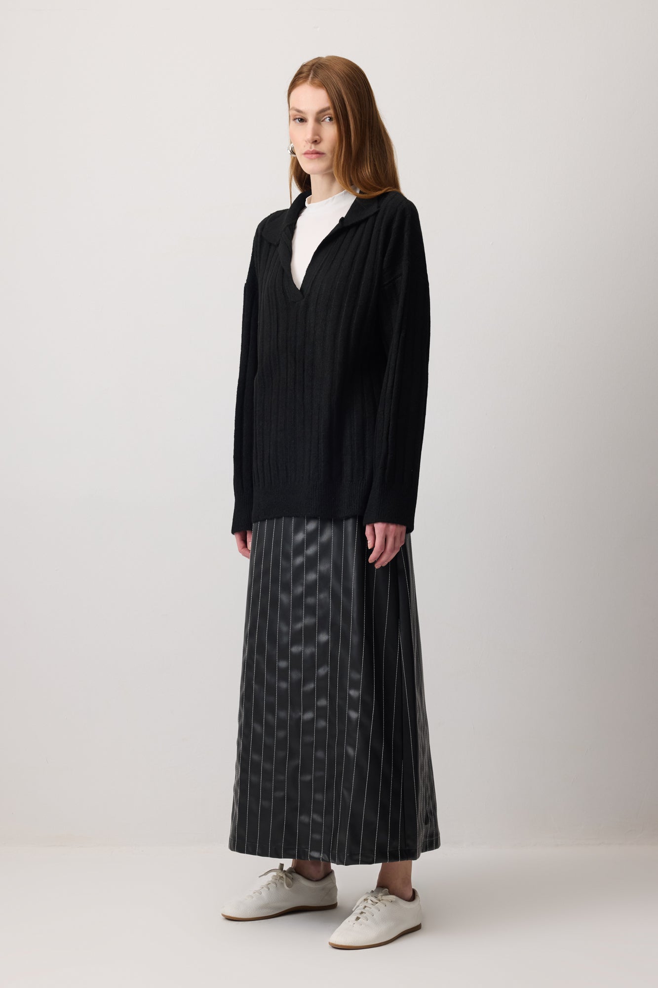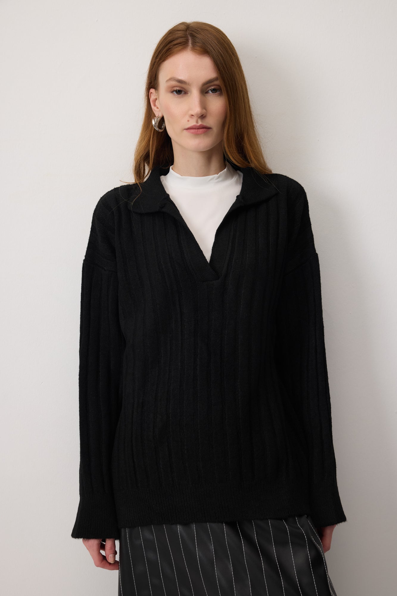 Polo yaka görünümlü V yaka, nervürlü dokulu triko kazak.