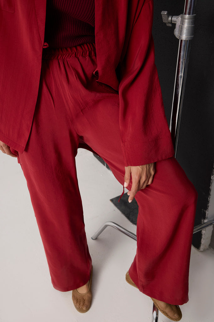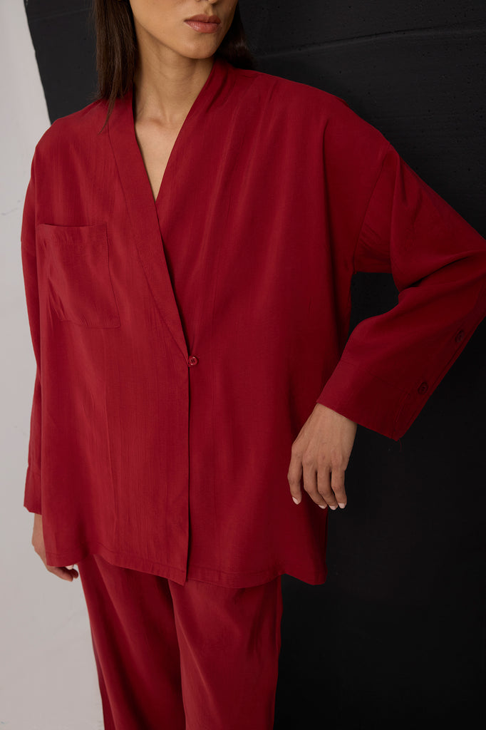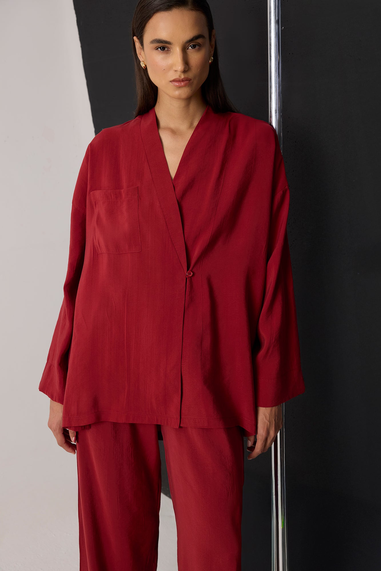 Viskon. V yaka. Tek cepli. Tek düğme kapamalı. Uzun boy pantolon. Elastik bel.