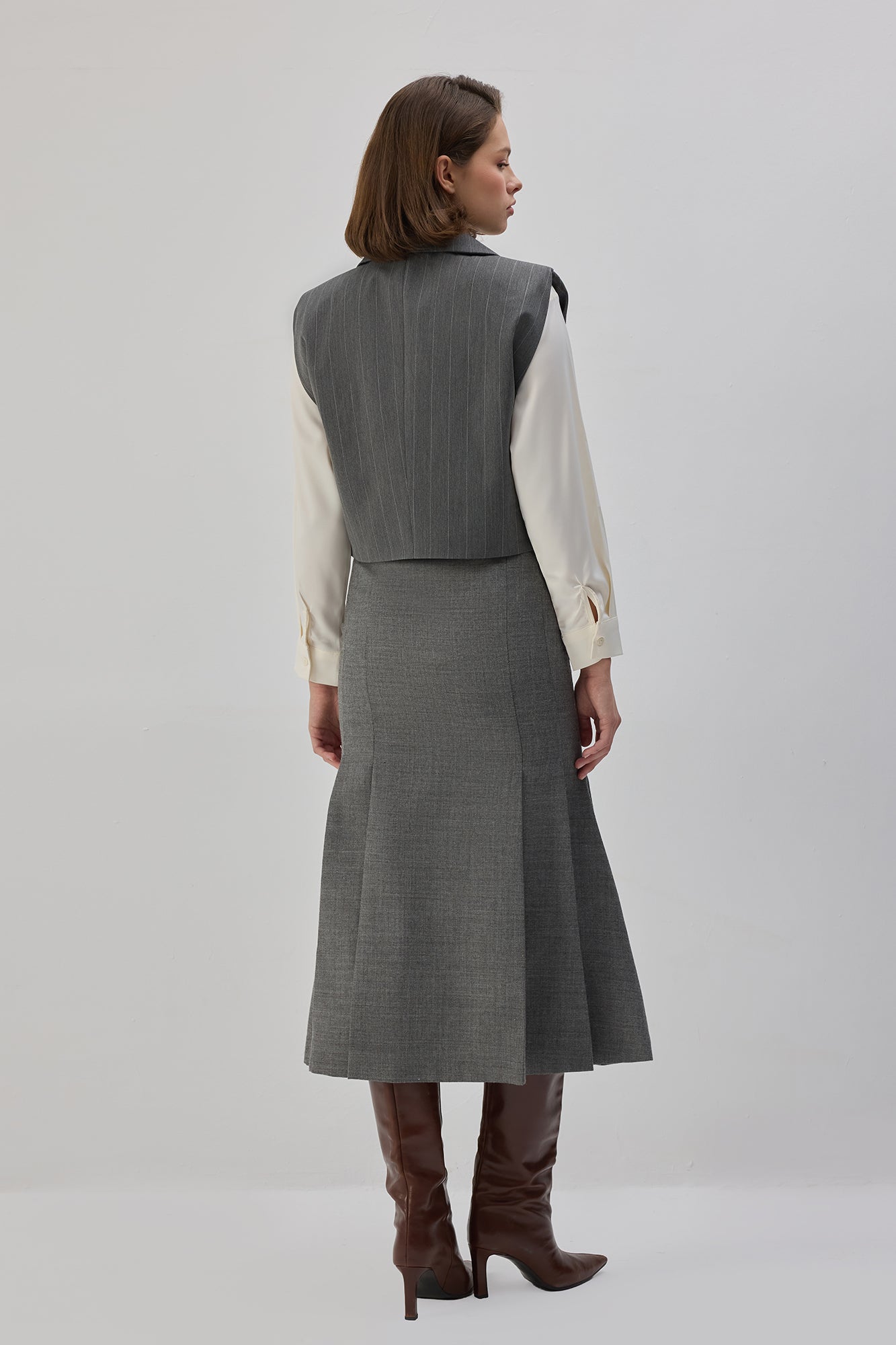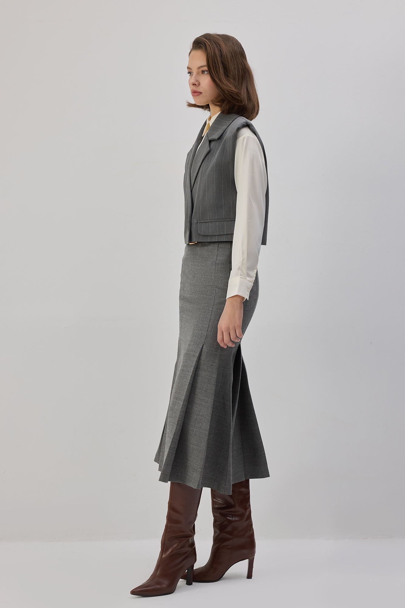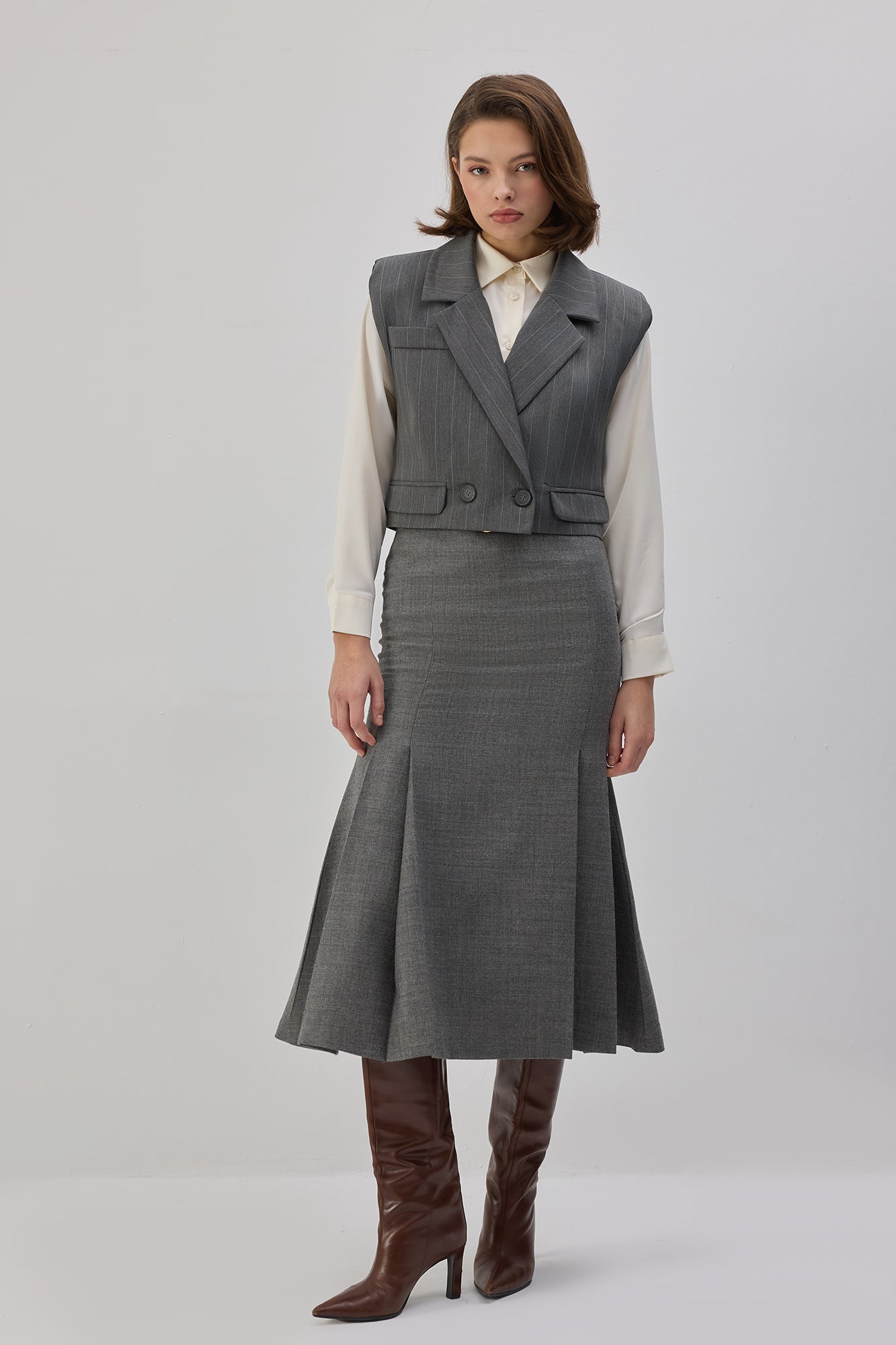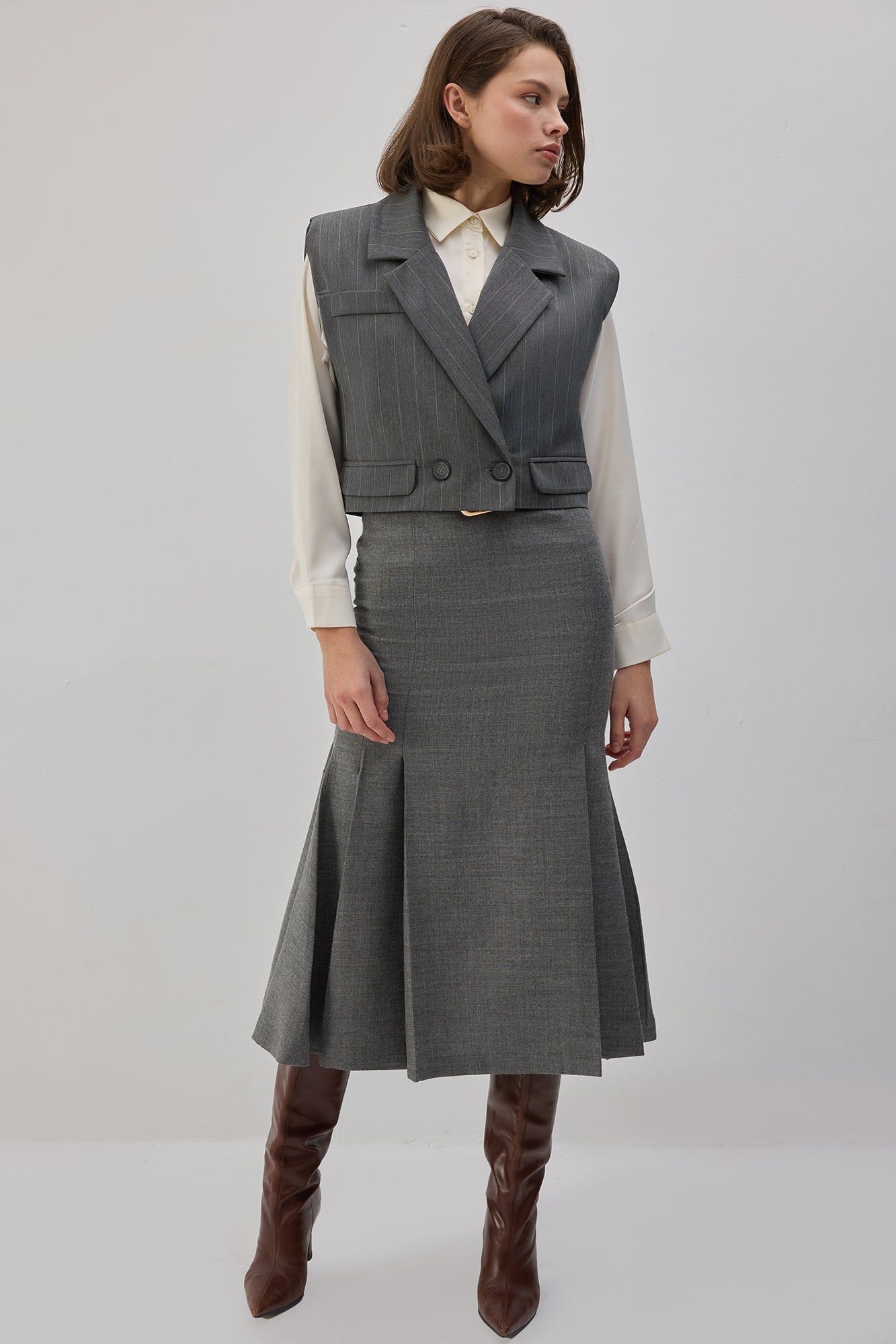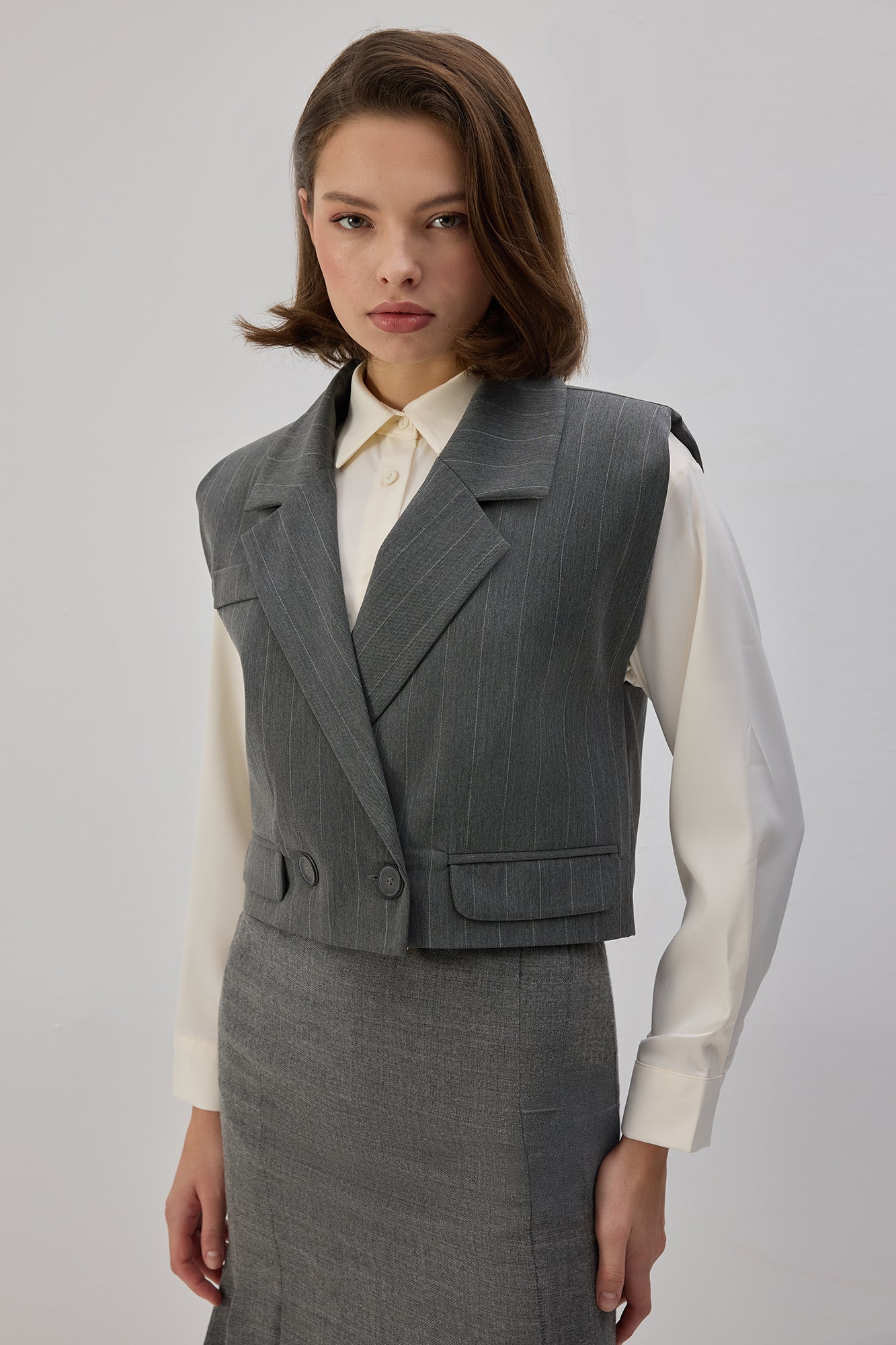 İnce çizgili. Kruvaze yaka. Vatkalı. Çift düğmeli kapama. Kısa yelek.