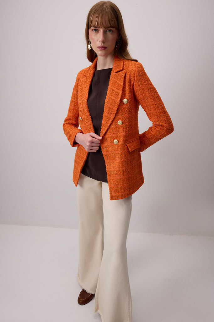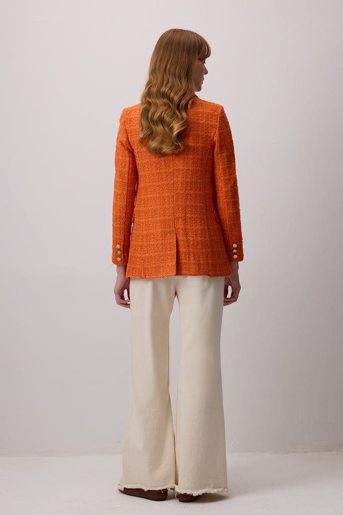 Klasik, çentik yaka. Uzun kollu. Kruvaze gold düğme kapamalı.