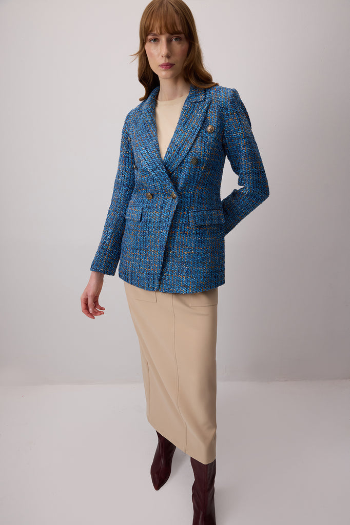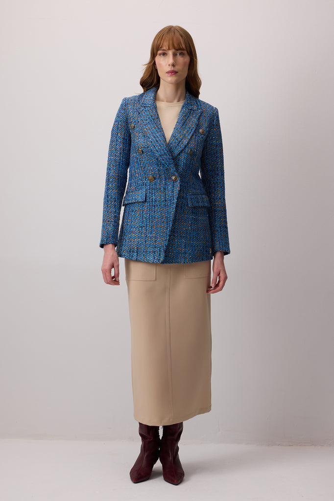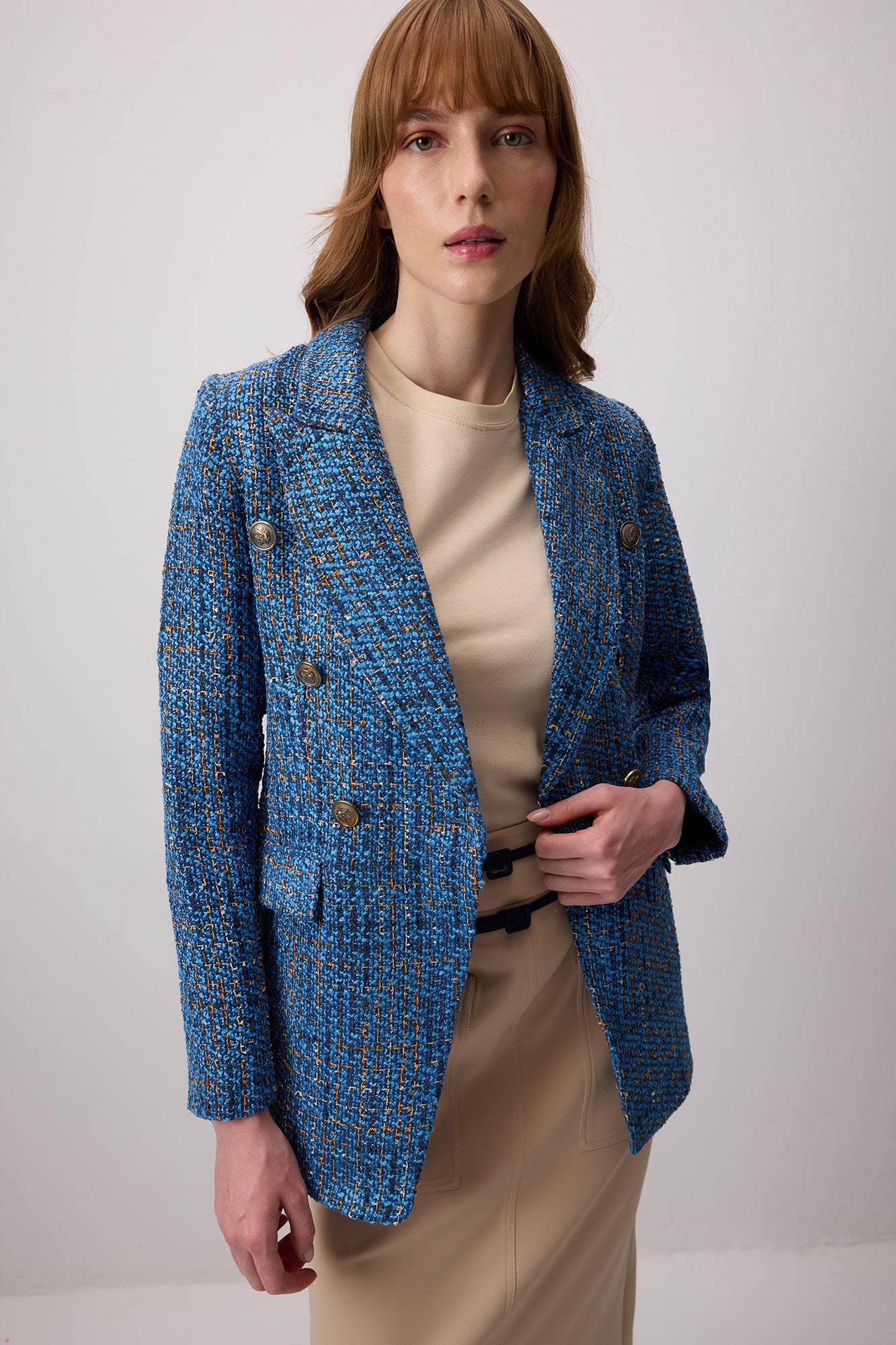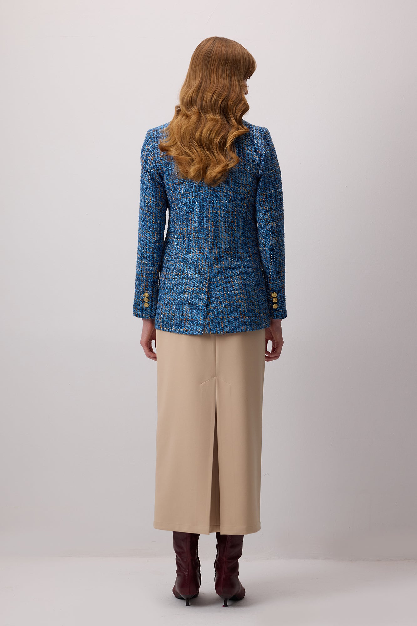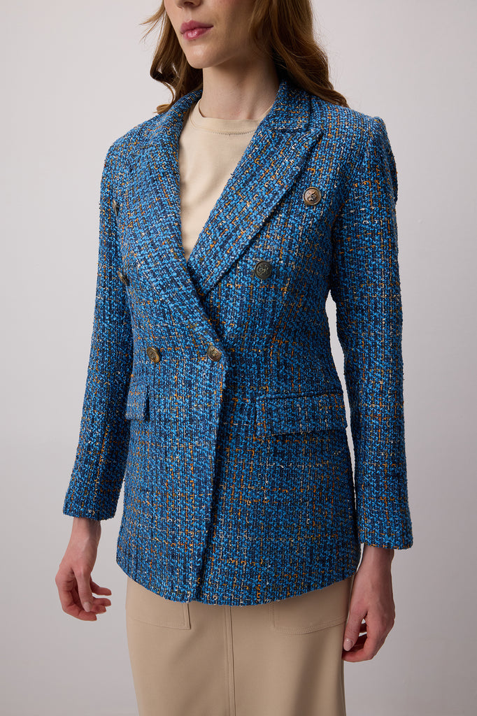 Klasik, çentik yaka. Uzun kollu. Kruvaze düğme kapamalı. Tüvit.