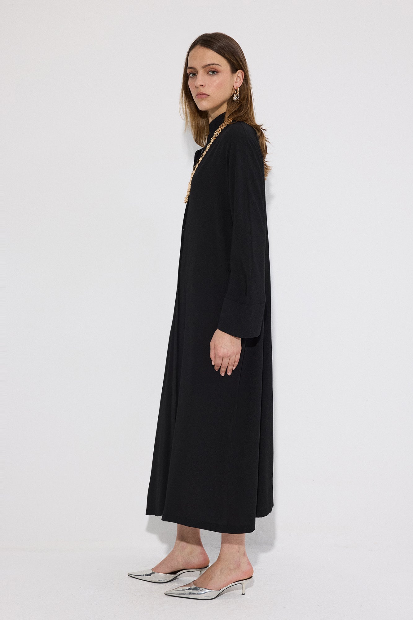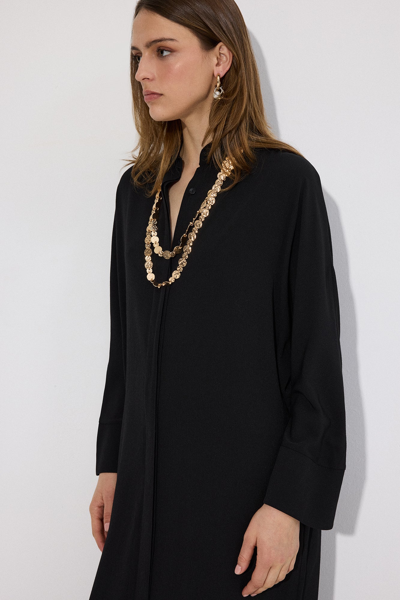Gömlek yaka. Önü gizli pat düğmeli. Uzun kollu. Midi boy.