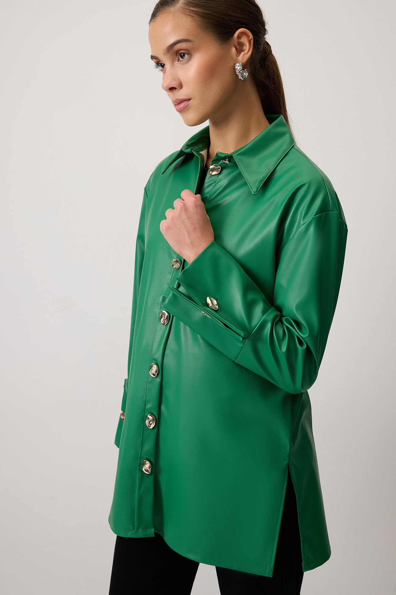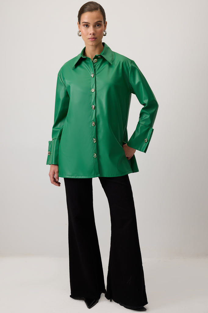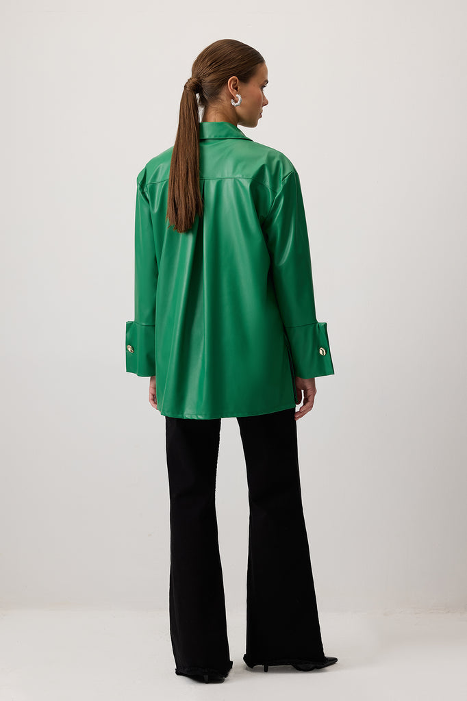Vegan Deri. İri düğmeli. Geniş manşetli gömlek.