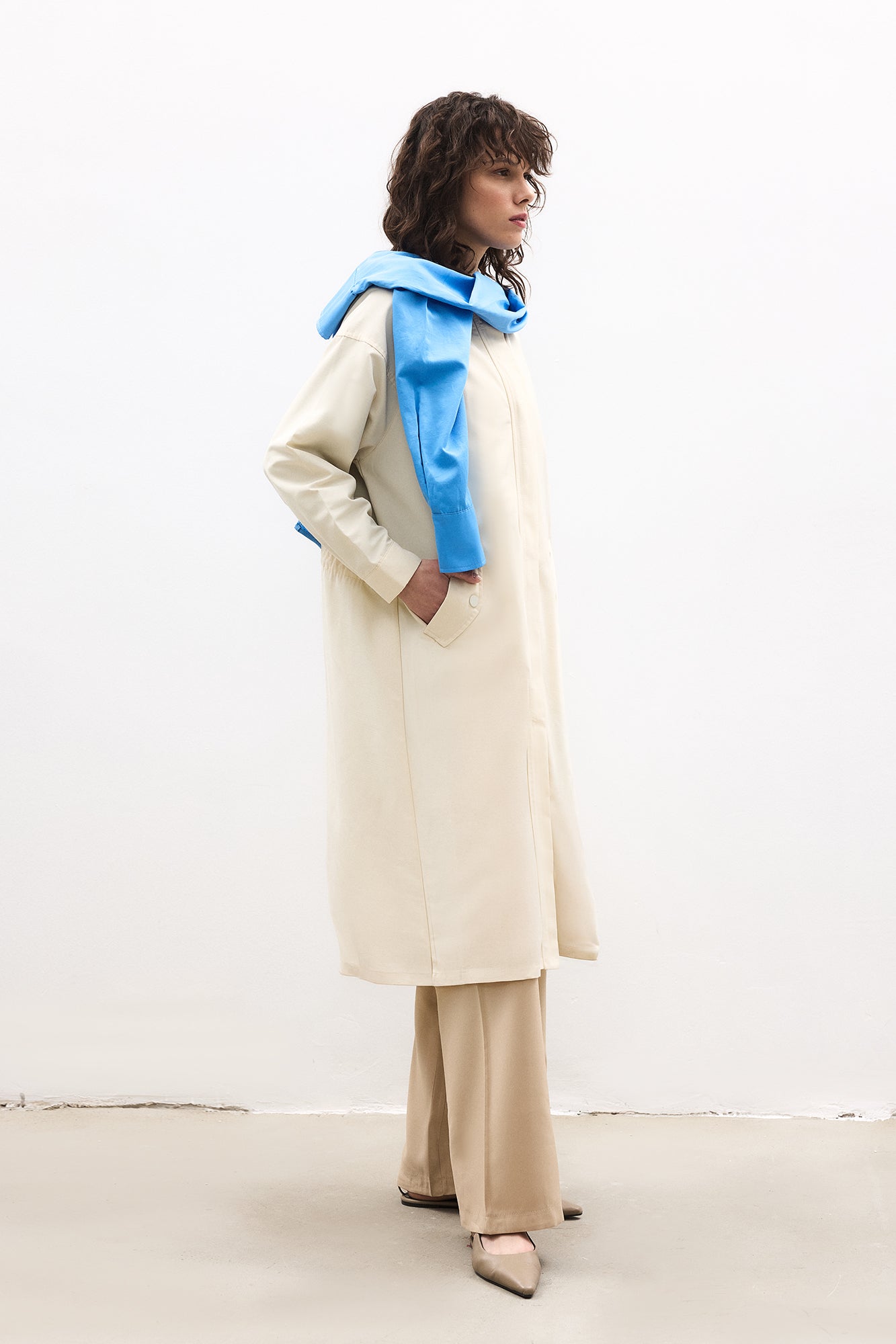 Ribana detaylı yaka. Uzun kol. Yan cepli. Önü fermuar kapamalı. Reglan kol. İç bel kısmında ayarlanabilir büzgü ip detayı.