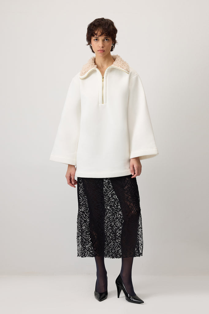 Klasik yaka. Yakası kürk detaylı. Uzun kollu. Önden yarım fermuar kapama.