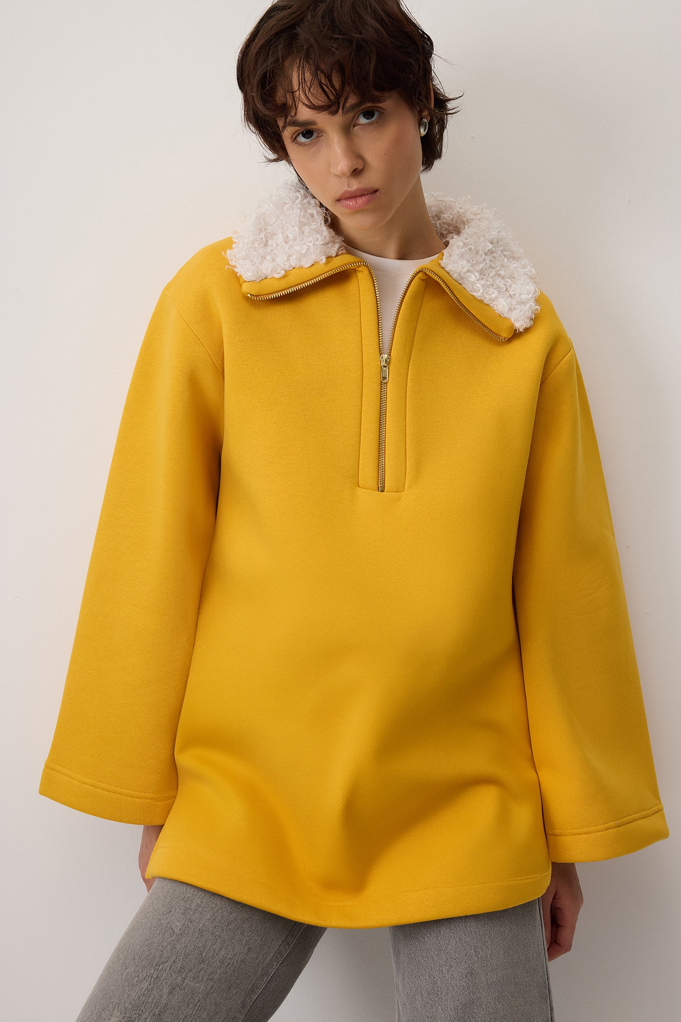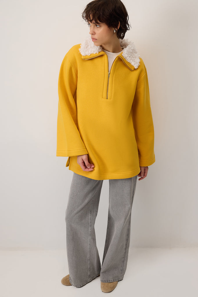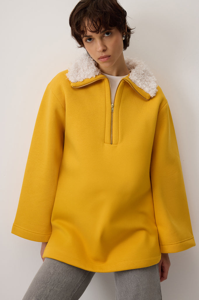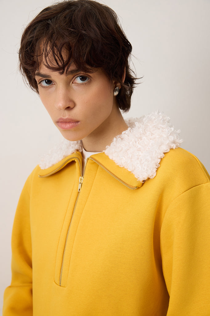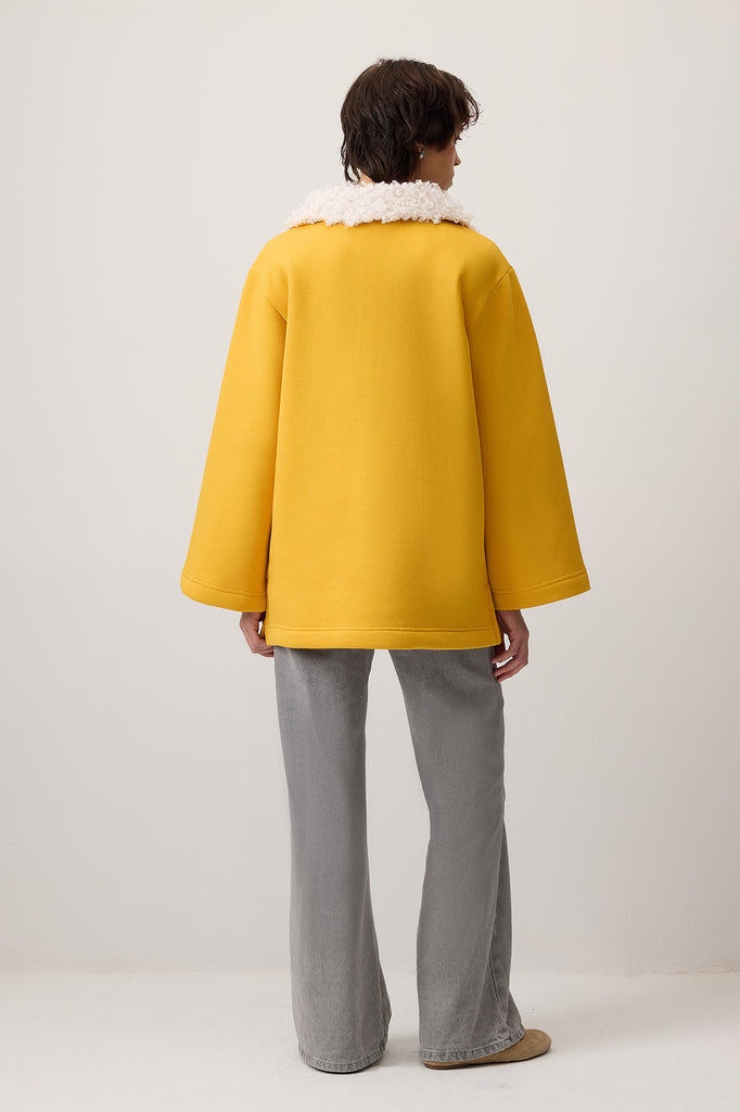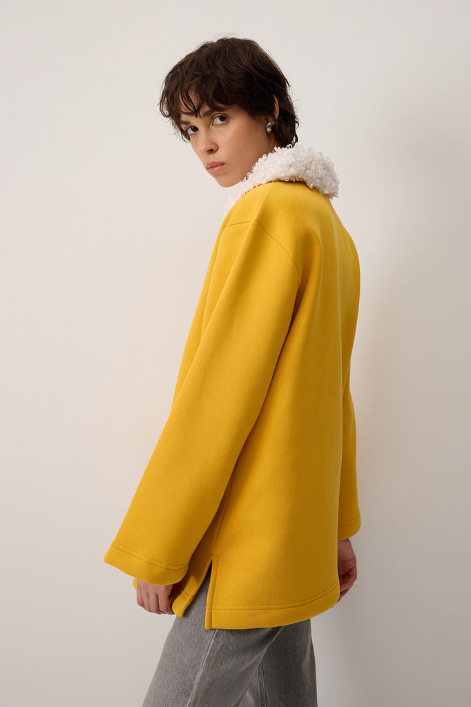 Klasik yaka. Yakası kürk detaylı. Uzun kollu. Önden yarım fermuar kapama.