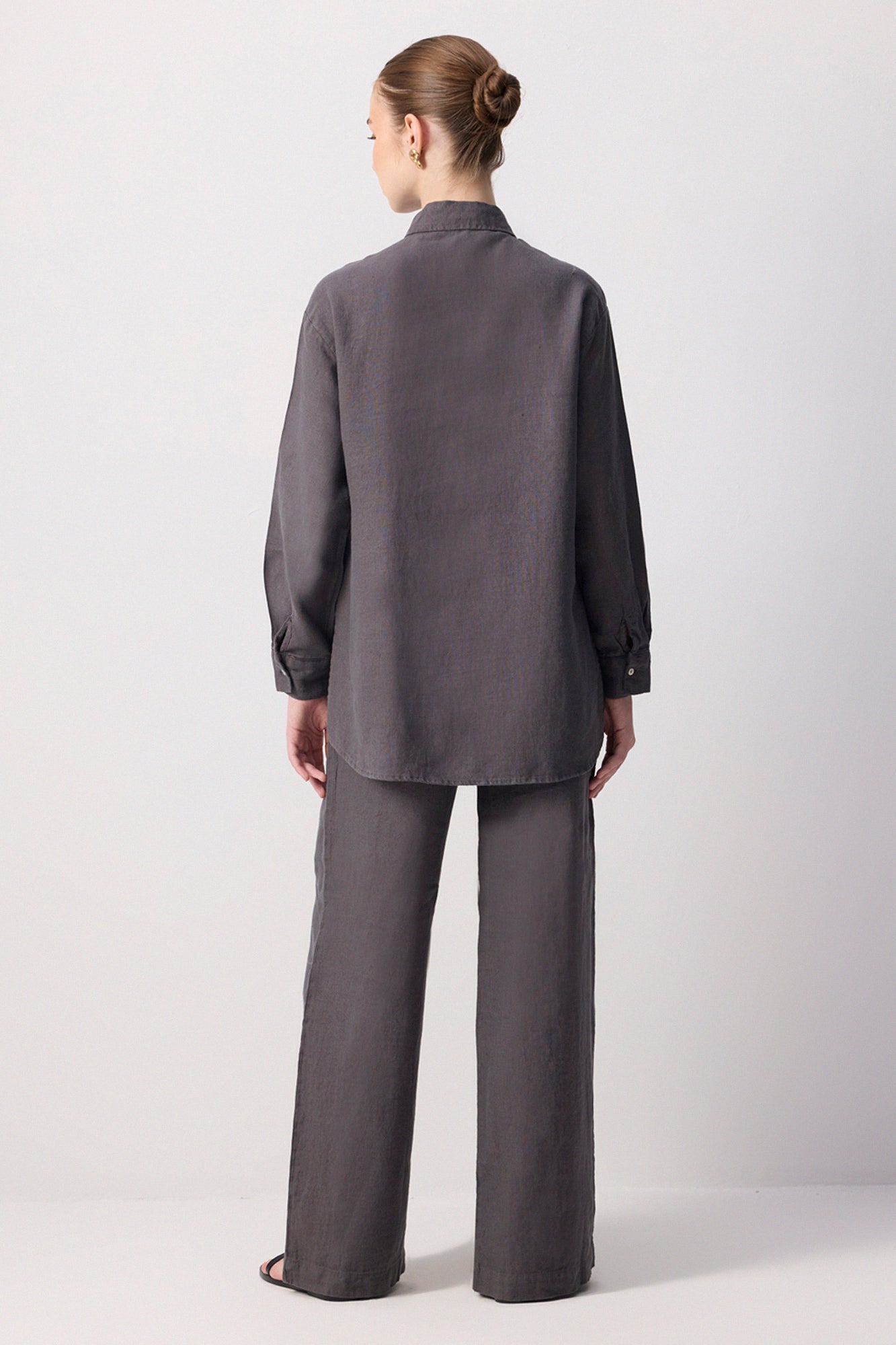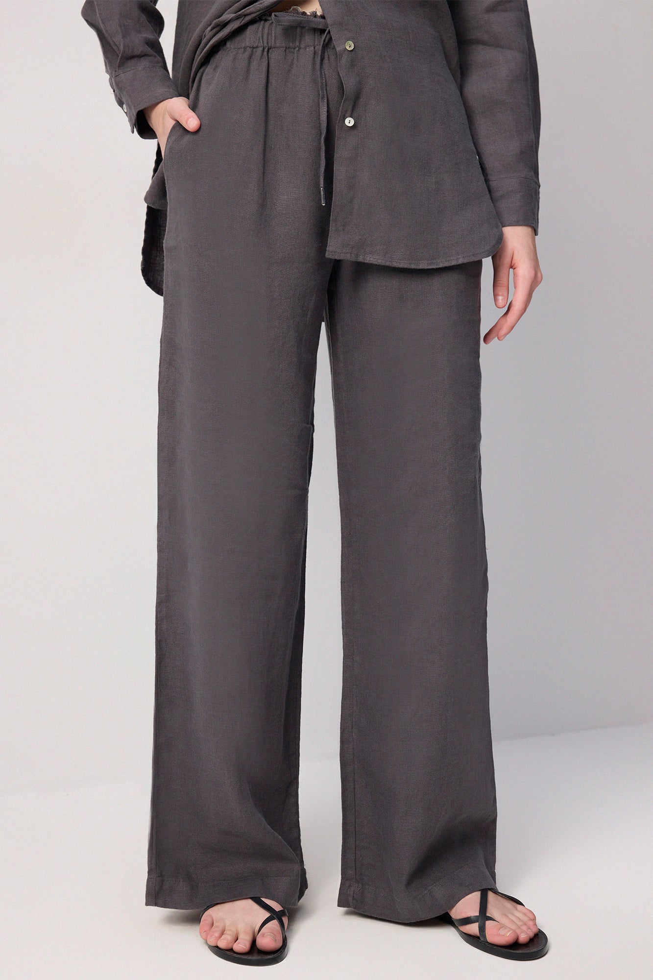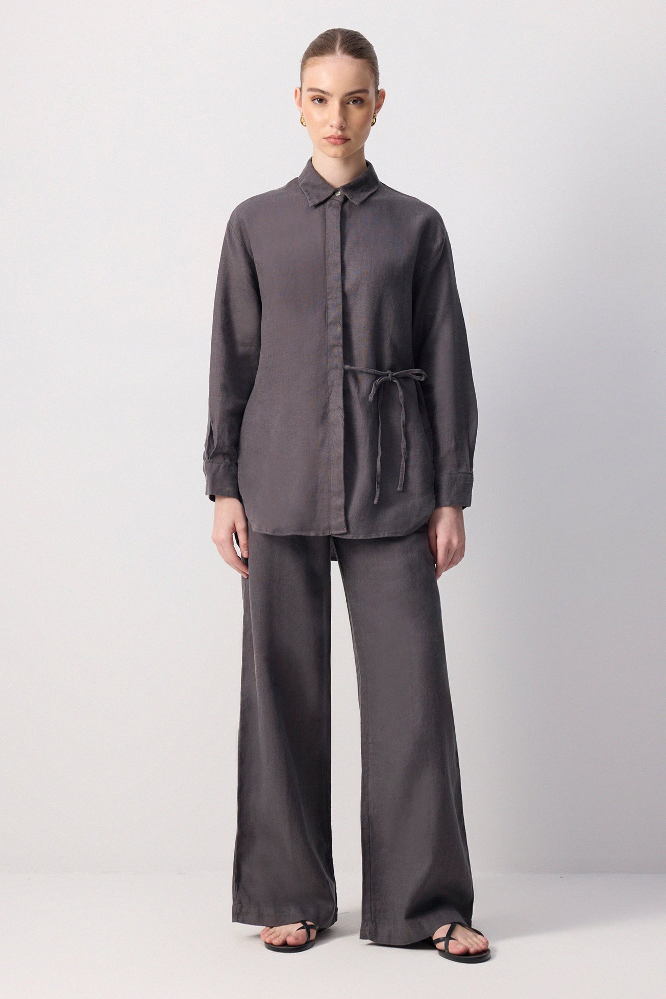 %100 Keten. Gömlek yaka. Ön gizli düğme kapamalı. Bağlama detaylı. Elastik bel. Bol paça. Uzun boy.