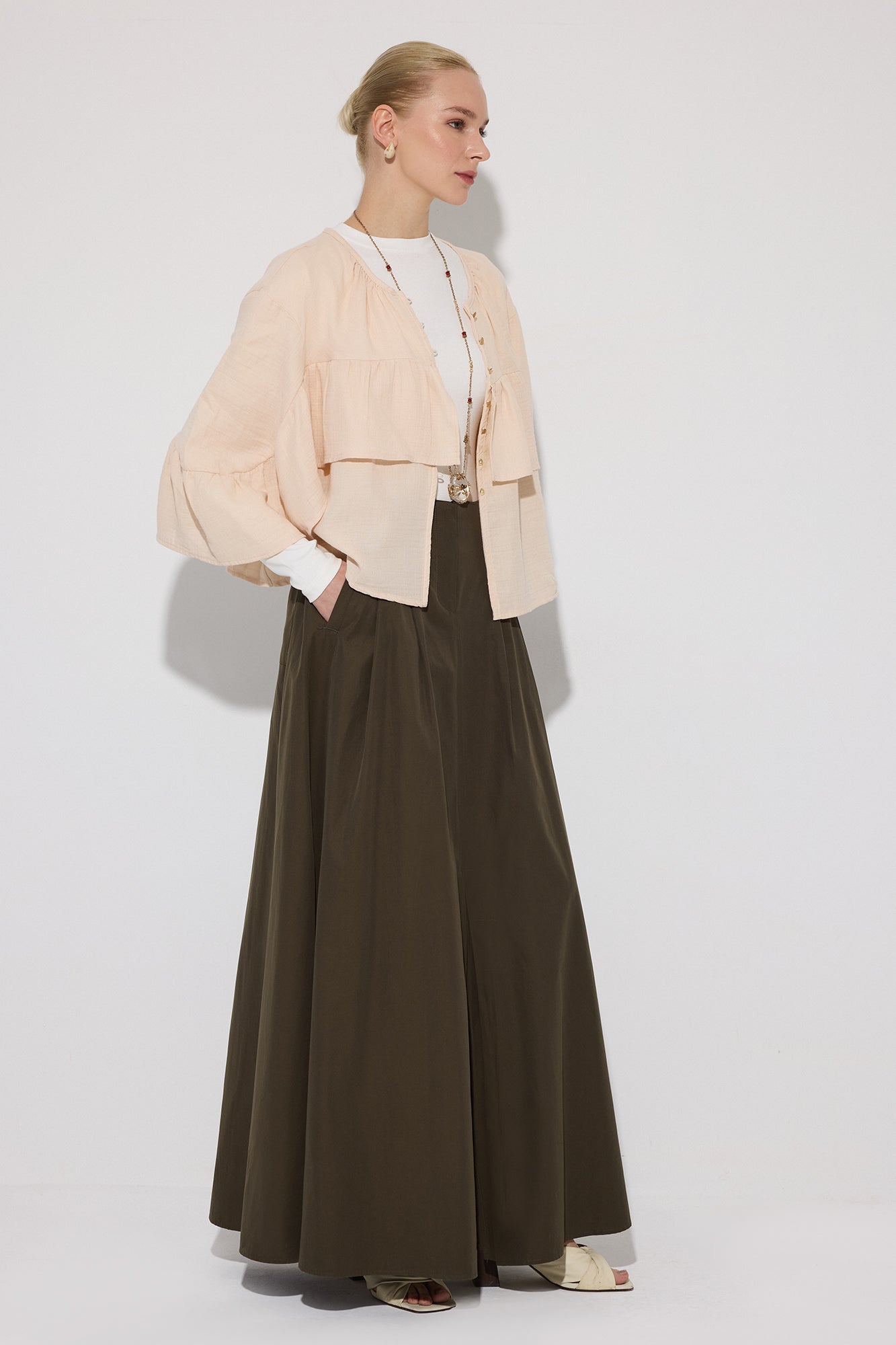 Bisiklet yaka. Gold düğme detaylı. Volanlı, geniş ve dökümlü kısa kol.