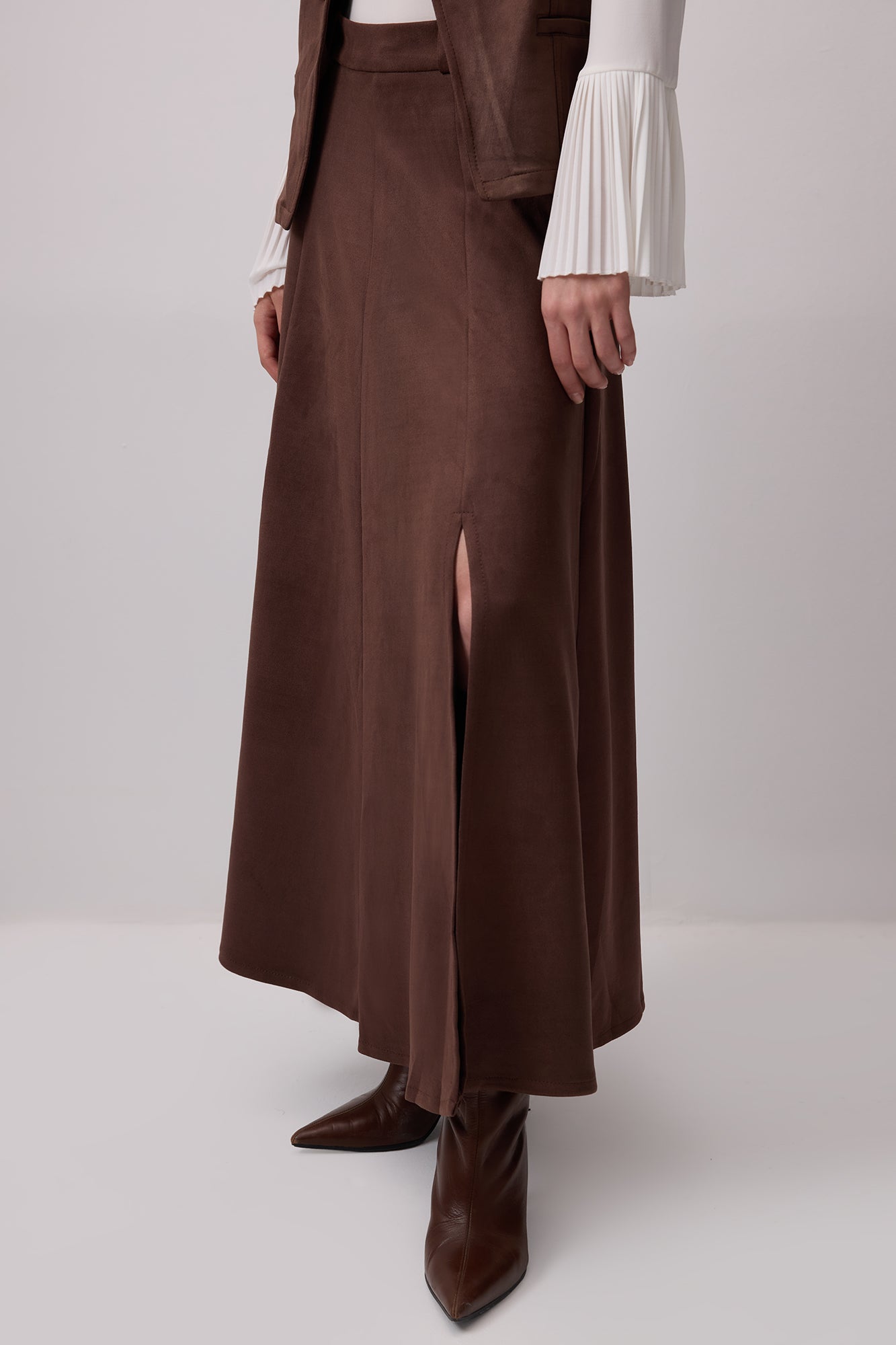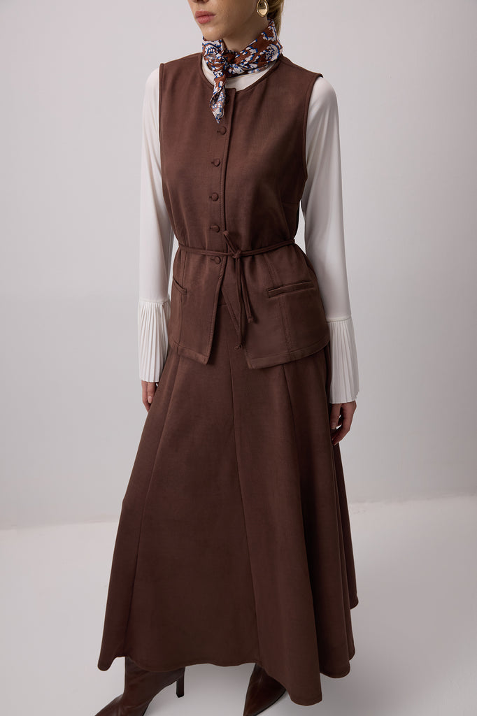Bisiklet yaka. Kolsuz. Kuşak detaylı. Önden düğme kapamalı. Süet yelek. Uzun boy. Yırtmaç detaylı. Gizli fermuar kapama. Süet etek.