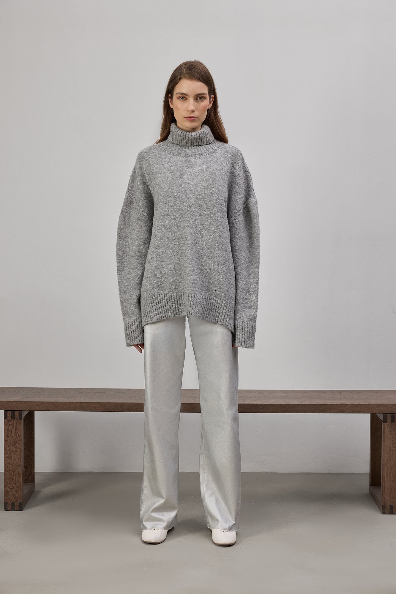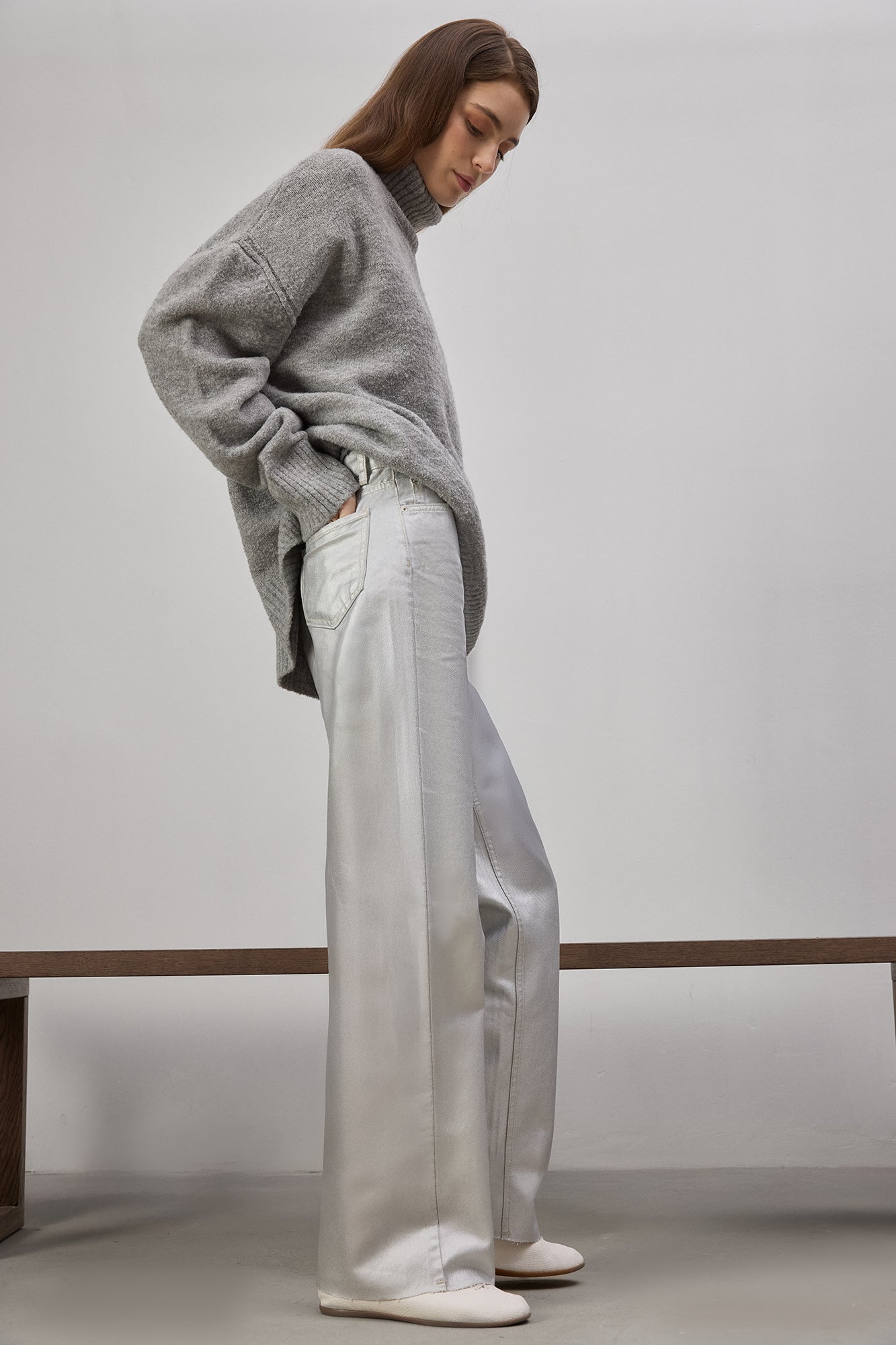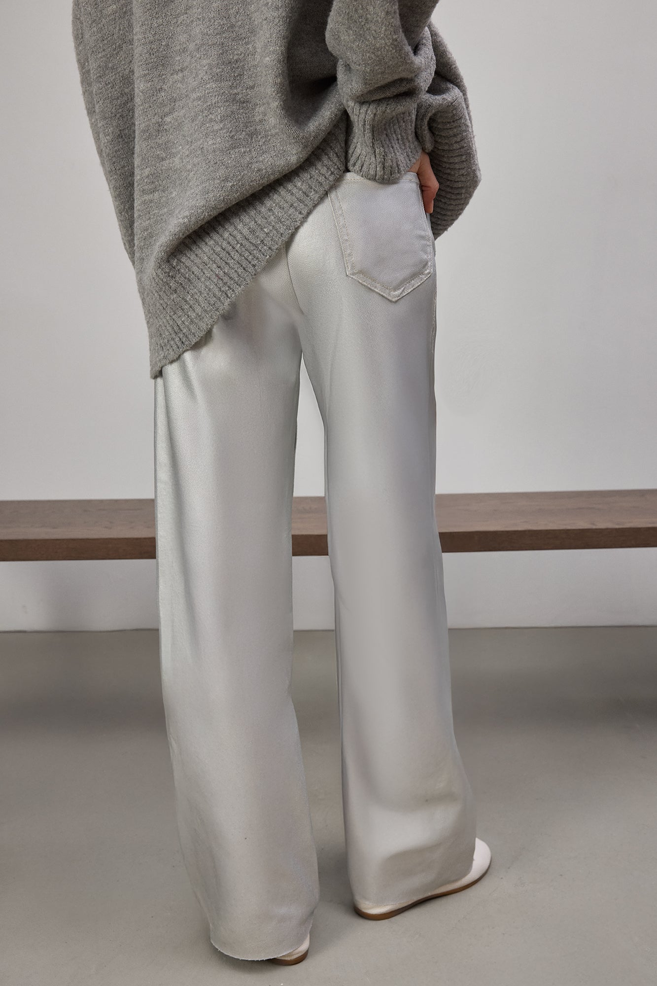 Yüksek bel. Düğme ve fermuar kapamalı. İki yan cep. Metalik pantolon.