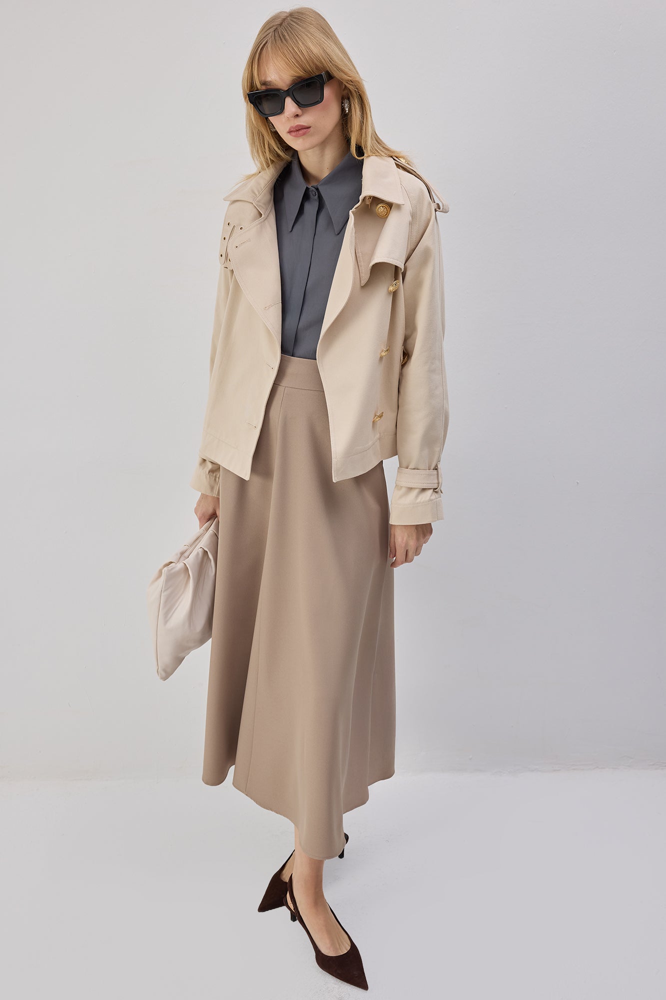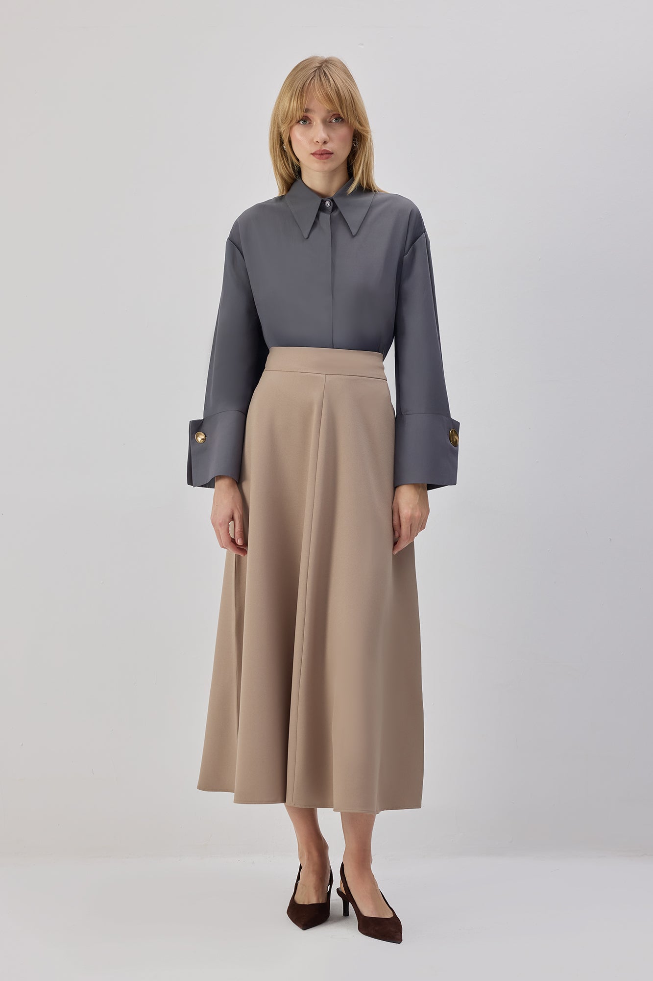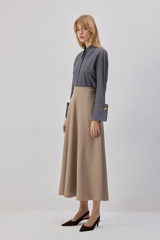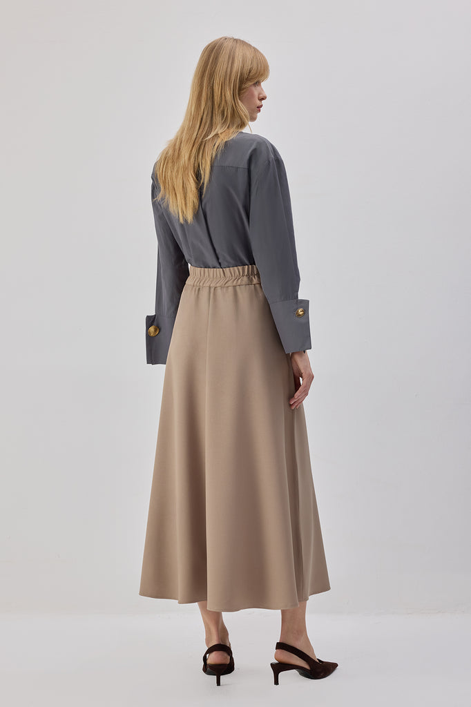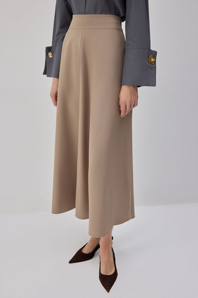 Yüksek bel. Akıcı dokulu. Parçalı etek.