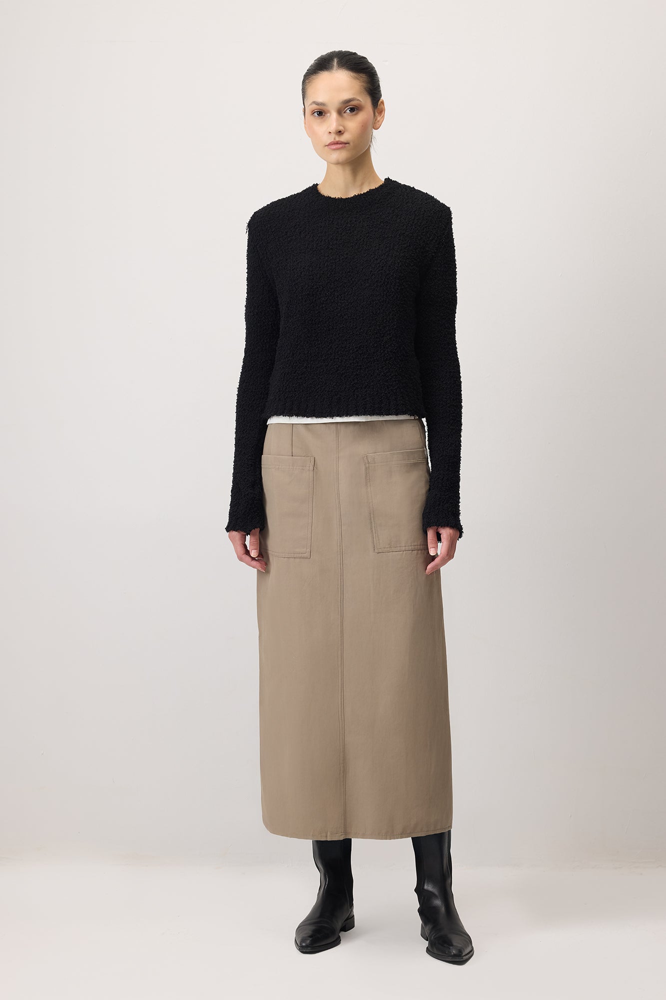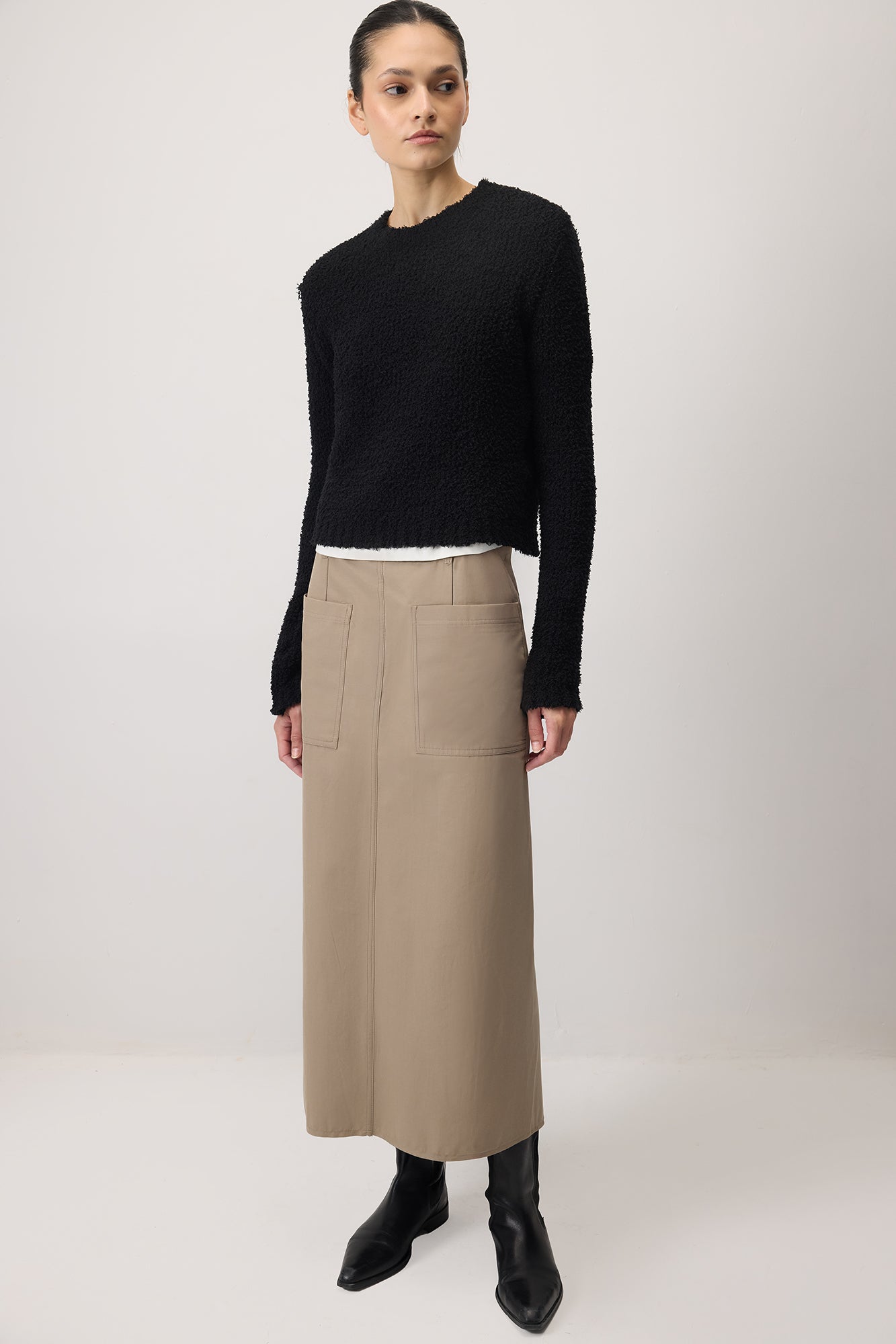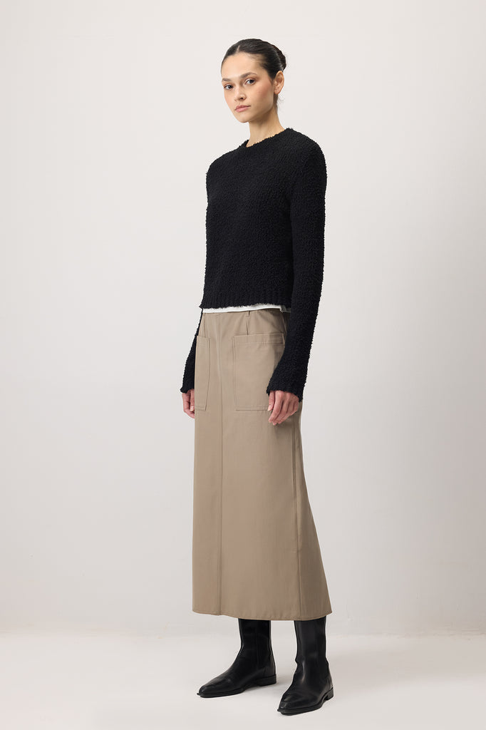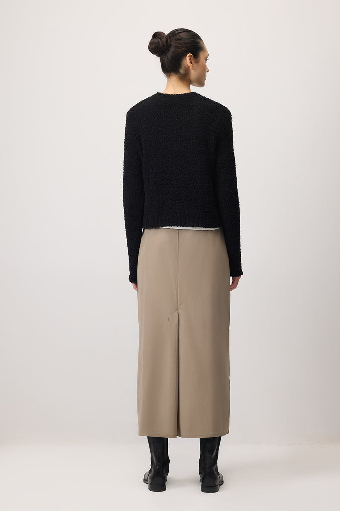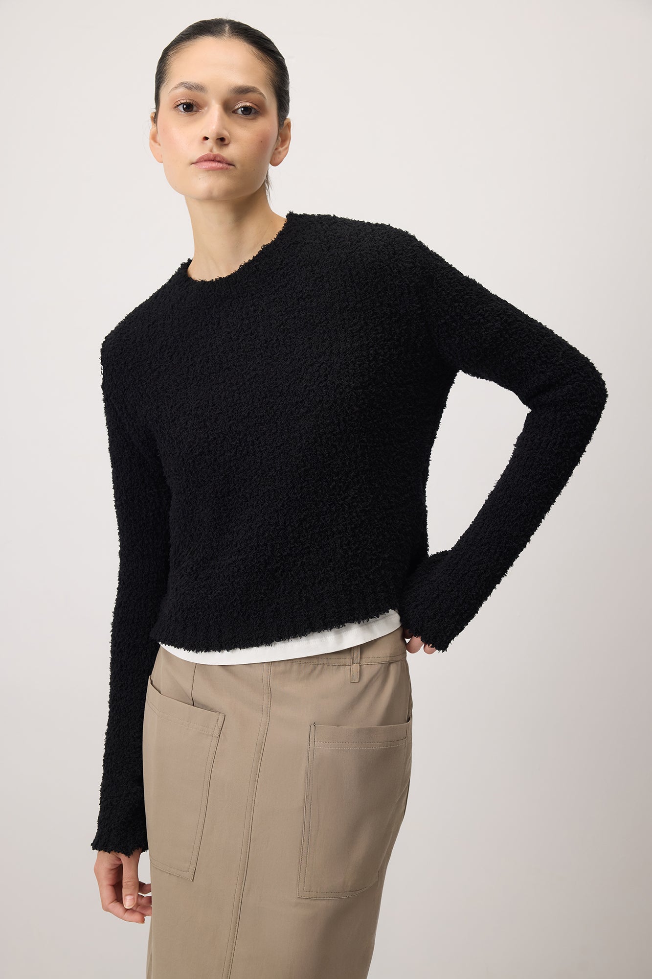 Doku örgülü, yuvarlak yakalı, uzun kollu triko kazak.