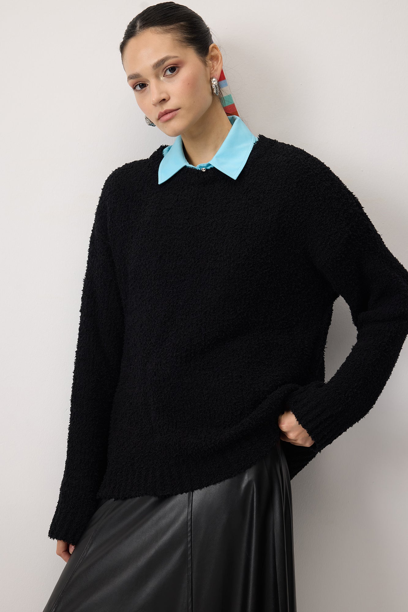 Yumuşak dokulu triko kazak. Rahat kalıp, bisiklet yaka, esnek yapı.
