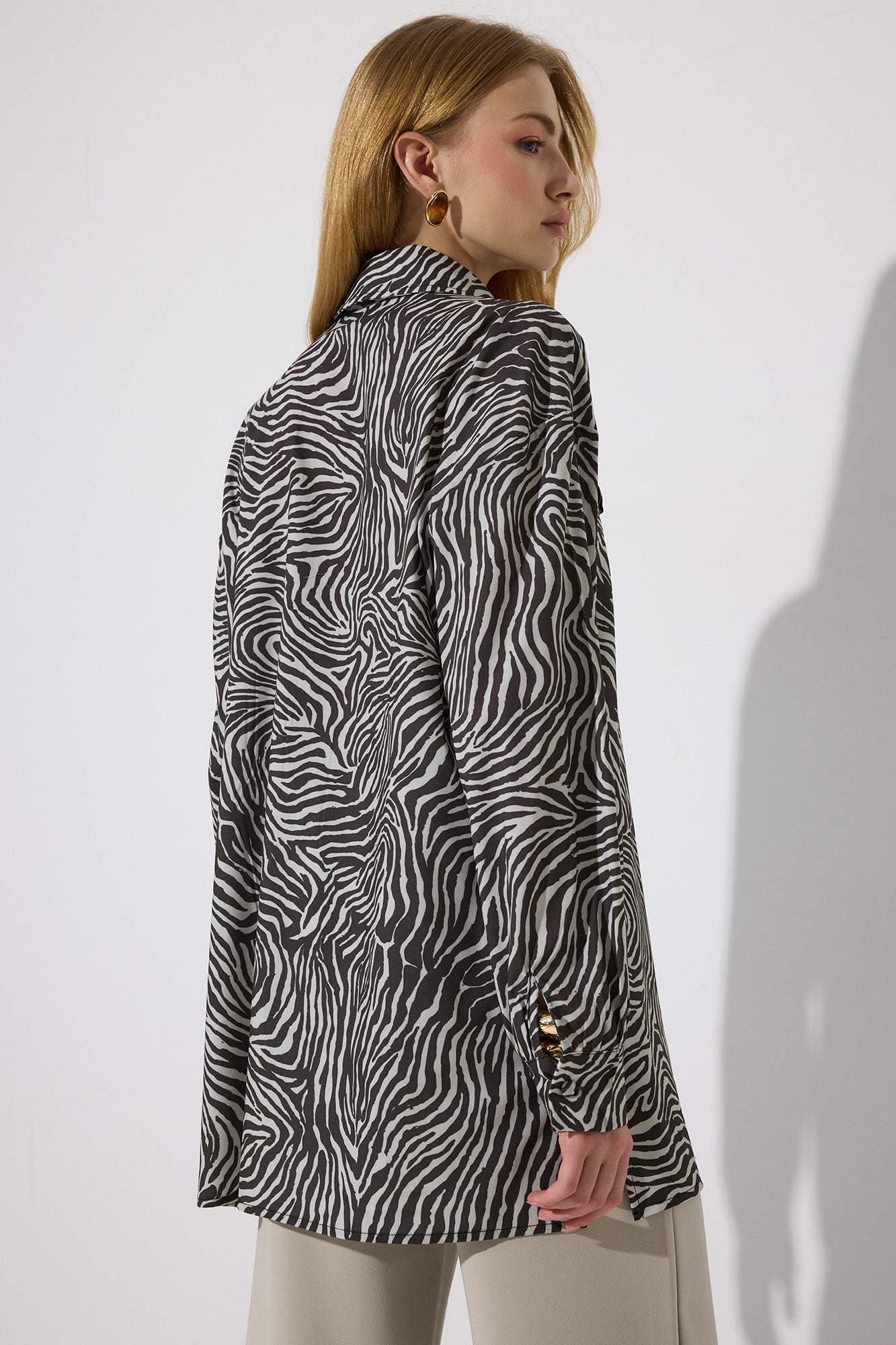 Zebra desenli. Bağlama yaka detaylı. Düğme kapamalı. Manşetli uzun kollu. Saten gömlek.